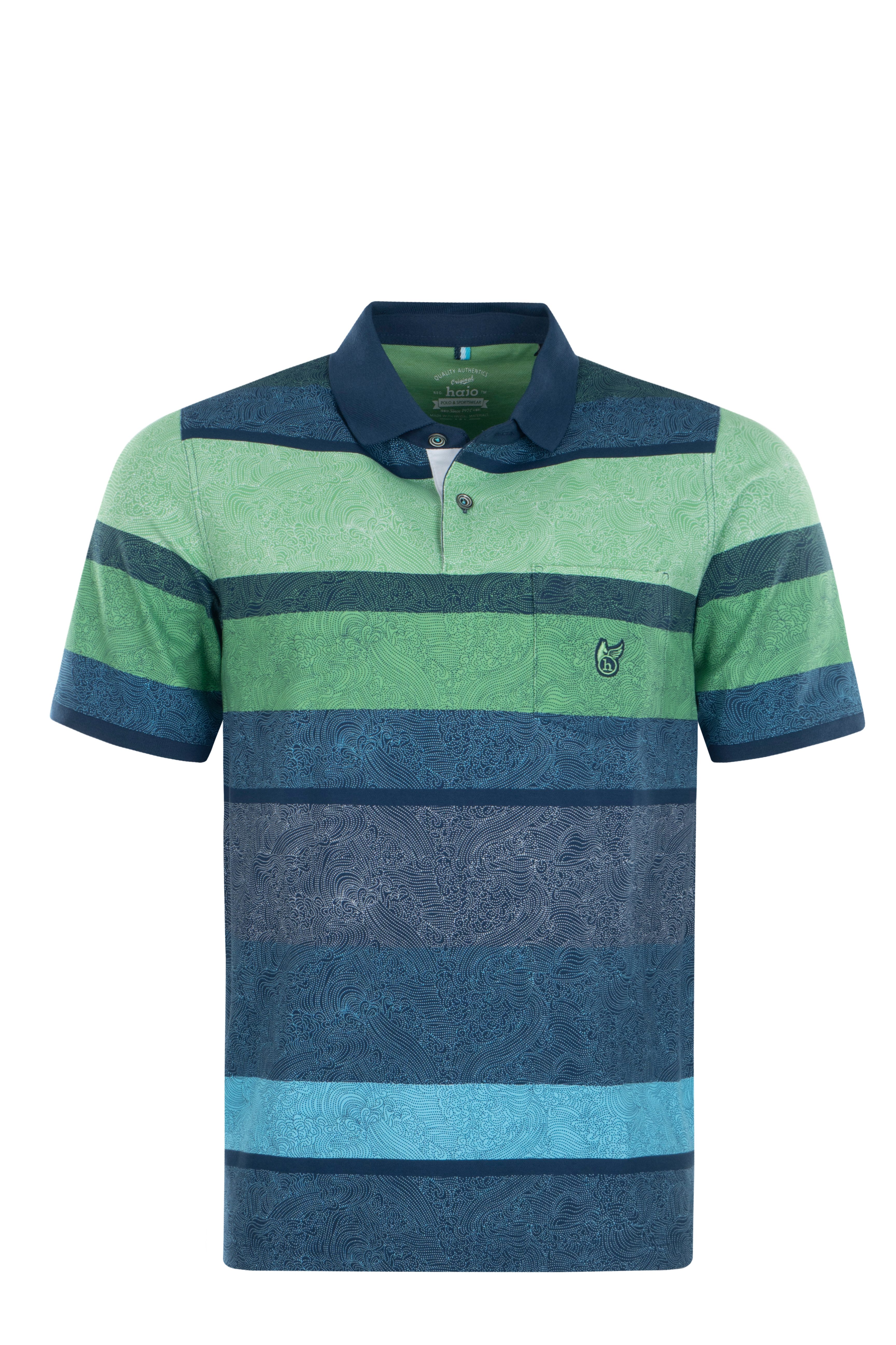 Piqué-Poloshirt von "hajo". Es zeichnet sich durch einen Flachstrickkragen mit einer 2-Knopf-Leiste und Alloverdruck aus. Das Shirt hat eine offene aufgesetzte Brusttasche und elastische Bündchenabschlüsse am Arm. Die offene Form mit Seitenschlitzen sorgt für angenehmen Tragekomfort und Pflegeleichtigkeit.