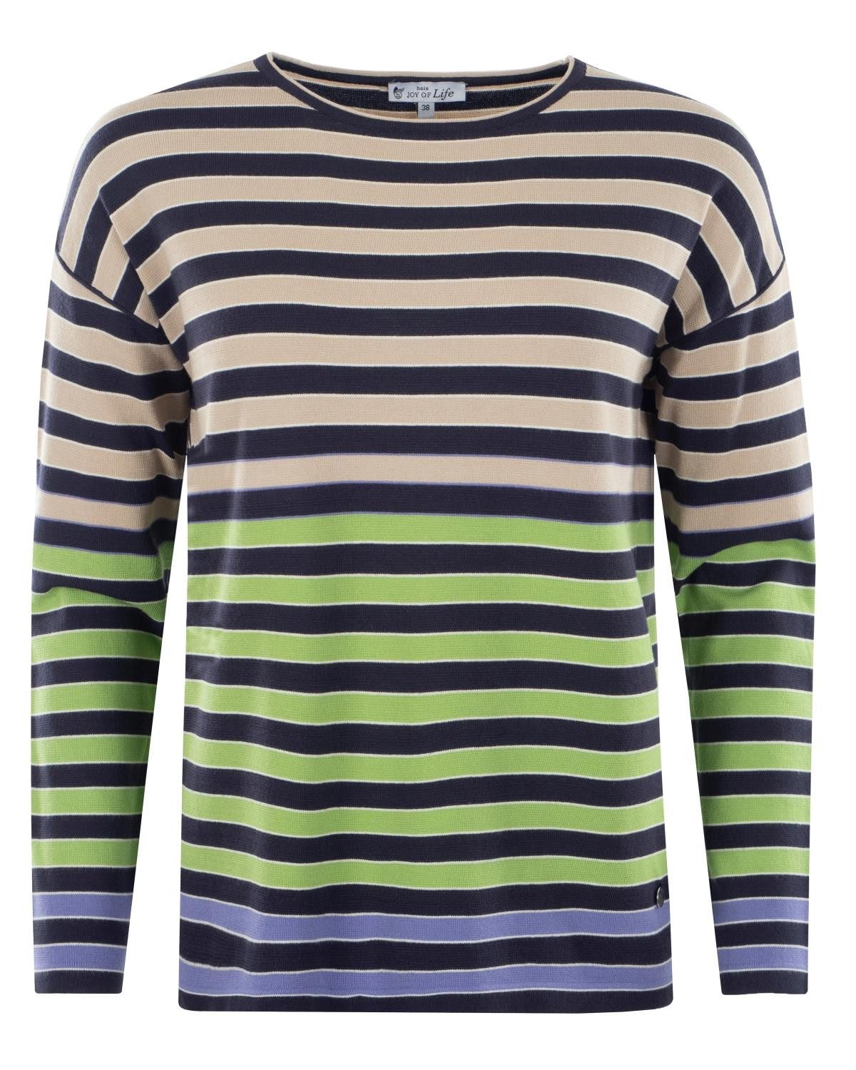 Perfekt gestylt mit dem Pullover von JOY OF Life aus weicher, feiner Viskosefaser. Der mehrfarbige Ringel und der überschnittene Arm stehen für einen modernen, sportiven Look.