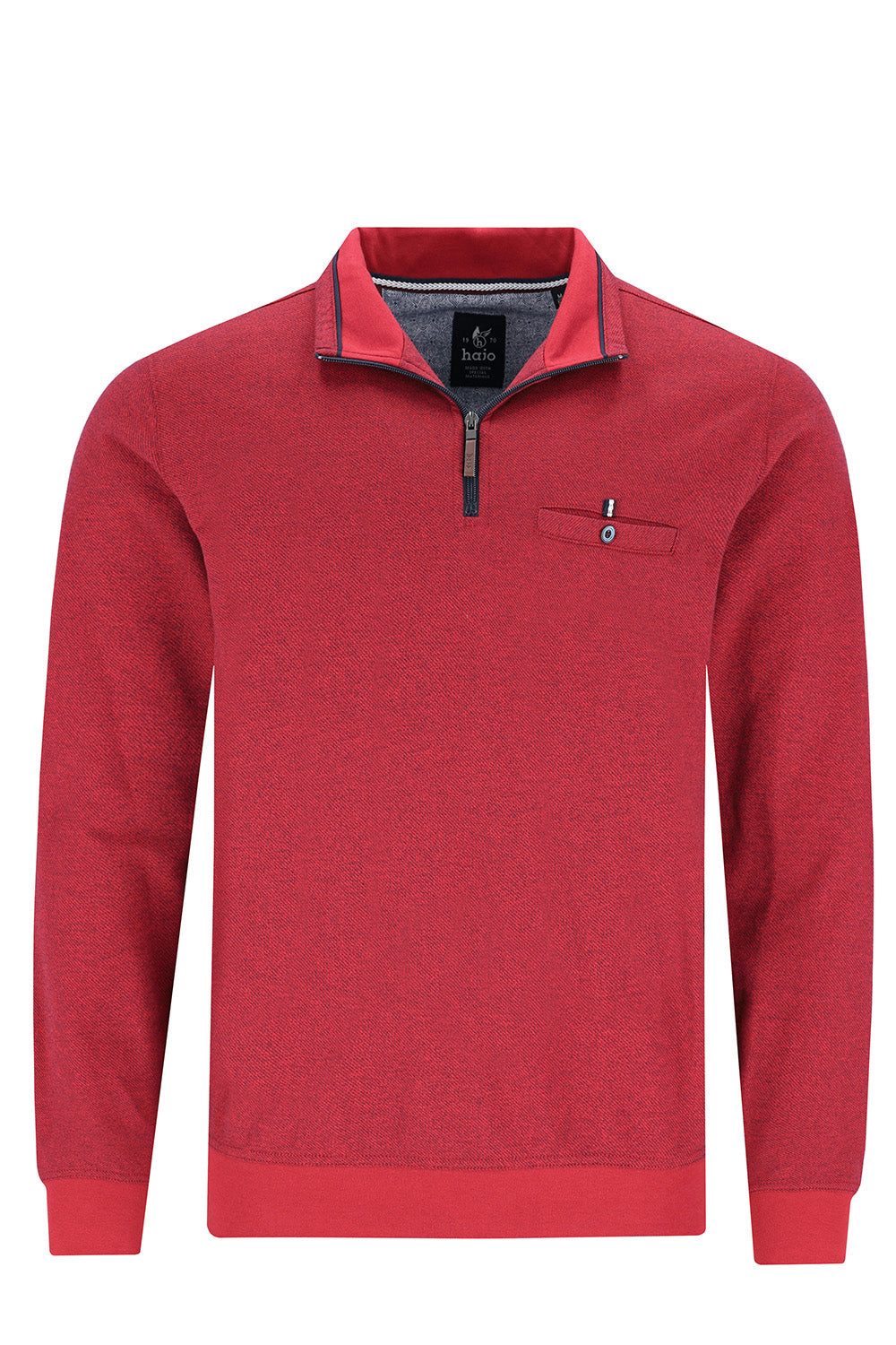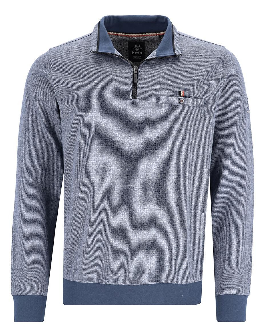 Sweatshirt von "hajo". Stehkragen mit Reißverschluss, eingeschnittene, geknöpfte Brusttasche, Jaspé-Garn allover, konstrastige Strickbündchen allover. Trageangenehm und pflegeleicht.