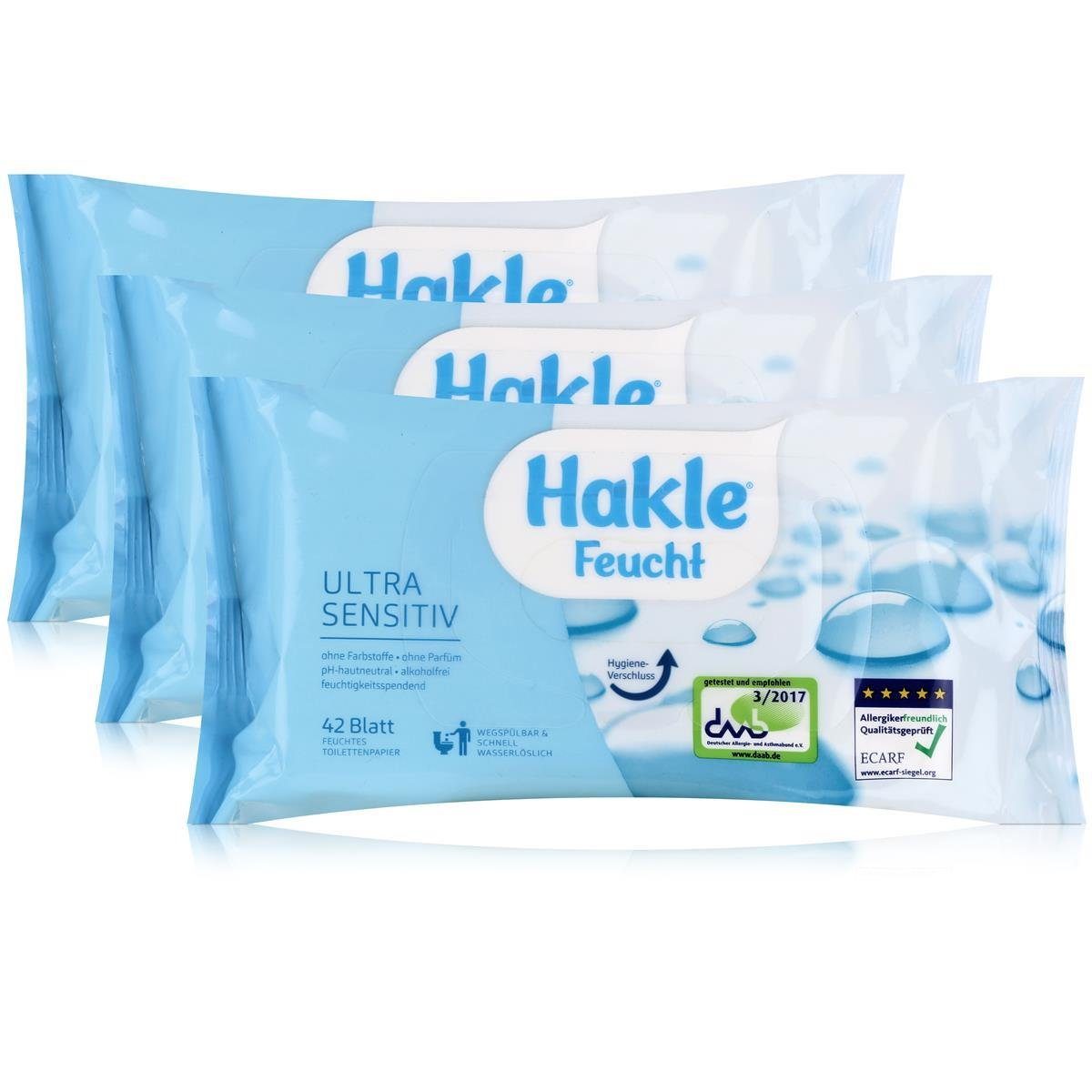 ;Im Lieferumfang enthalten: Hakle Feucht Ultra Sensitiv- feuchtes Toilettenpapier 42 Blatt ; 3er PackInhaltsstoffe | Aqua, Propylene Glycol, Panthenol, Coco-Glucoside, Octyldodecanol, Dicaprylyl Carbonate, Polyglyceryl-4 Caprate, Citric Acid, Sodium Hydroxide, Phenoxyethanol, Benzoic Acid, Dehydroacetic Acid |