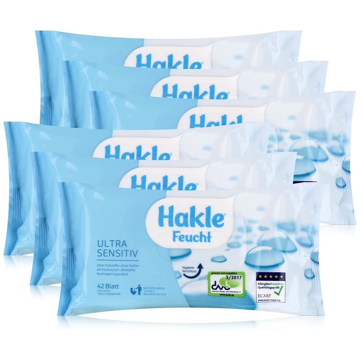 ;Im Lieferumfang enthalten: Hakle Feucht Ultra Sensitiv- feuchtes Toilettenpapier 42 Blatt ; 6er PackInhaltsstoffe | Aqua, Propylene Glycol, Panthenol, Coco-Glucoside, Octyldodecanol, Dicaprylyl Carbonate, Polyglyceryl-4 Caprate, Citric Acid, Sodium Hydroxide, Phenoxyethanol, Benzoic Acid, Dehydroacetic Acid |