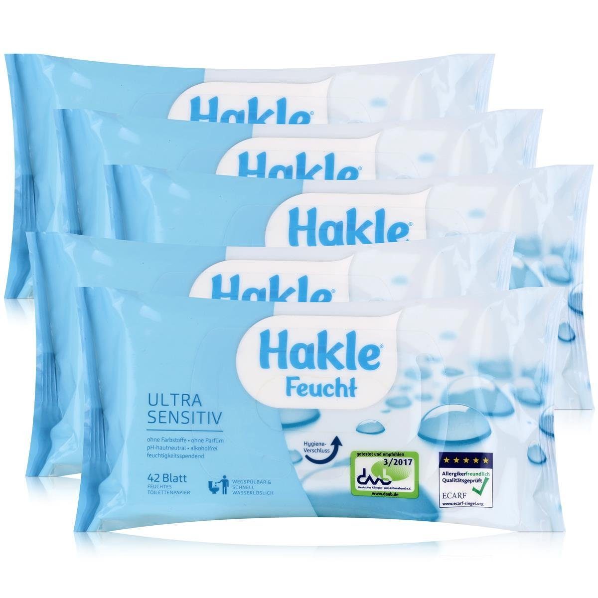 ;Im Lieferumfang enthalten: Hakle Feucht Ultra Sensitiv- feuchtes Toilettenpapier 42 Blatt ; 5er PackInhaltsstoffe | Aqua, Propylene Glycol, Panthenol, Coco-Glucoside, Octyldodecanol, Dicaprylyl Carbonate, Polyglyceryl-4 Caprate, Citric Acid, Sodium Hydroxide, Phenoxyethanol, Benzoic Acid, Dehydroacetic Acid |