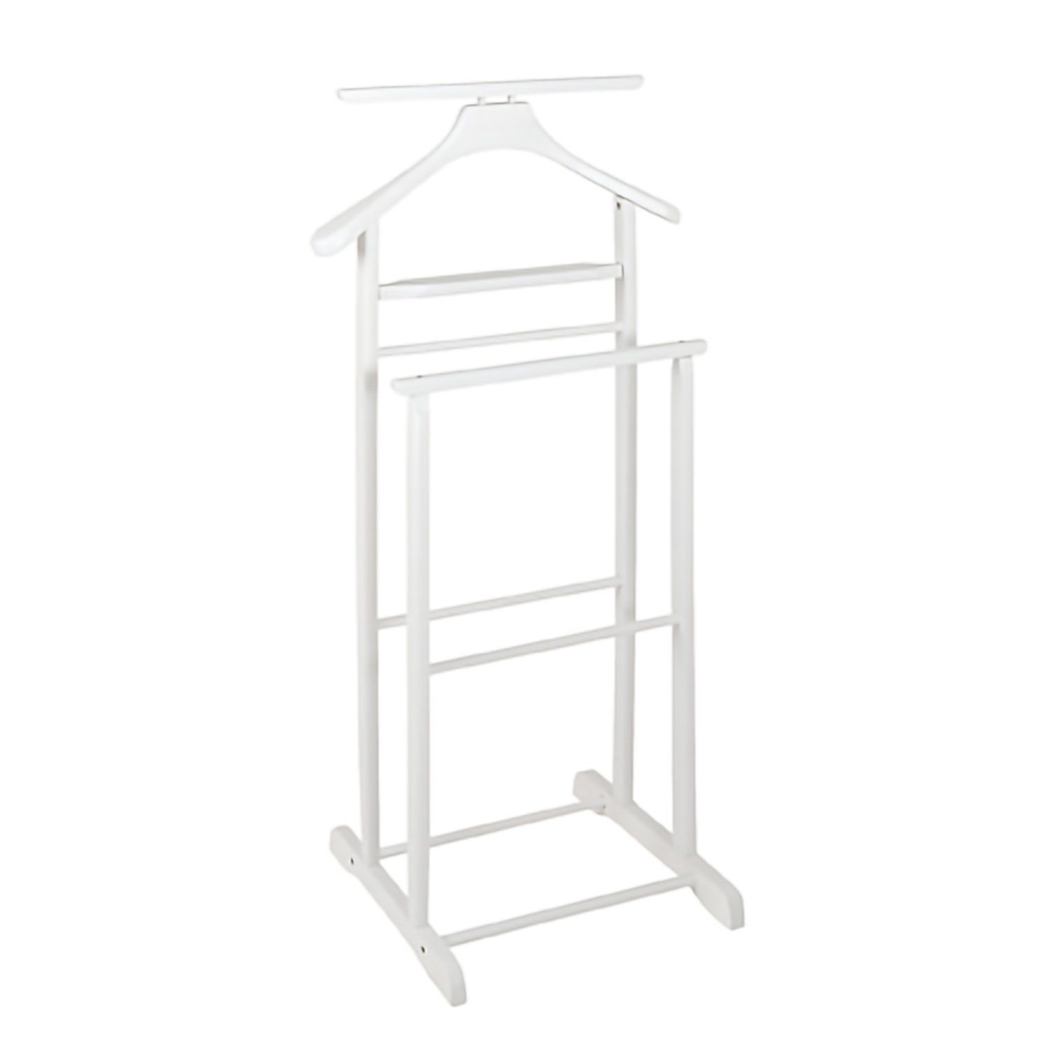 Der Kleiderständer aus hochwertigem, weissen Massivholz von HAKU Möbel sorgt dafür, dass in Ihrem Schlafzimmer oder im Ankleideraum stets Ordnung zu finden ist. So gehören verknitterte Hosen, Sakkos, Hemden oder Blazer der Vergangenheit an. Sie sparen Zeit am Morgen und finden alles griffbereit vor - lästiges Aufbügeln entfällt. Der Kleiderbutler hat einen Kleiderbügel. So können Sie Röcke, Blusen, Shirts oder auch Jacken knitterfrei und in Griffweite aufhängen. Die Kombination aus dem Massivholz in weiß und einem zeitlosen Design macht diesen Kleiderständer zu einem stilvollen und funktionellen Einrichtungsgegenstand, der zu jedem Einrichtungsstil passt.