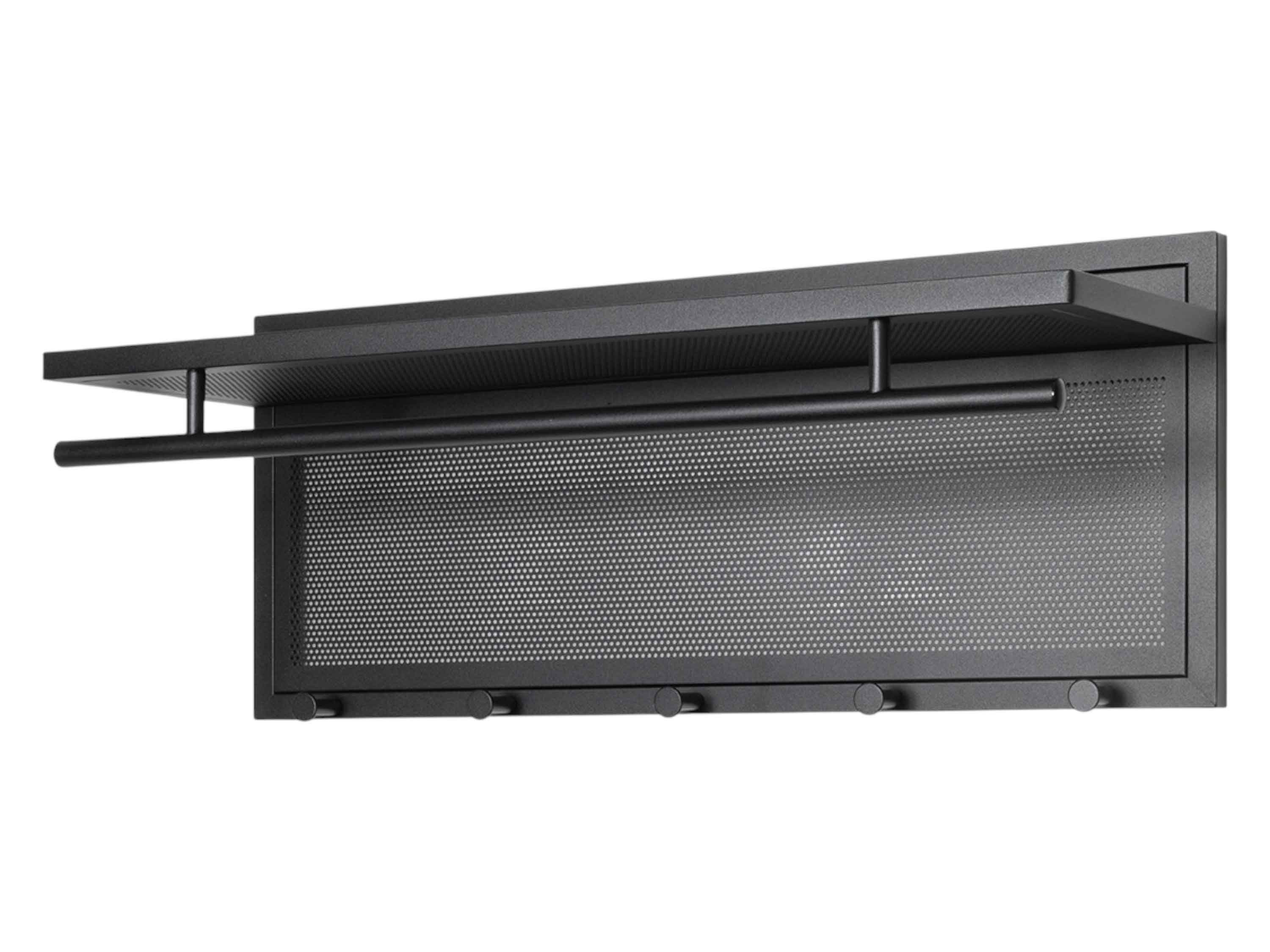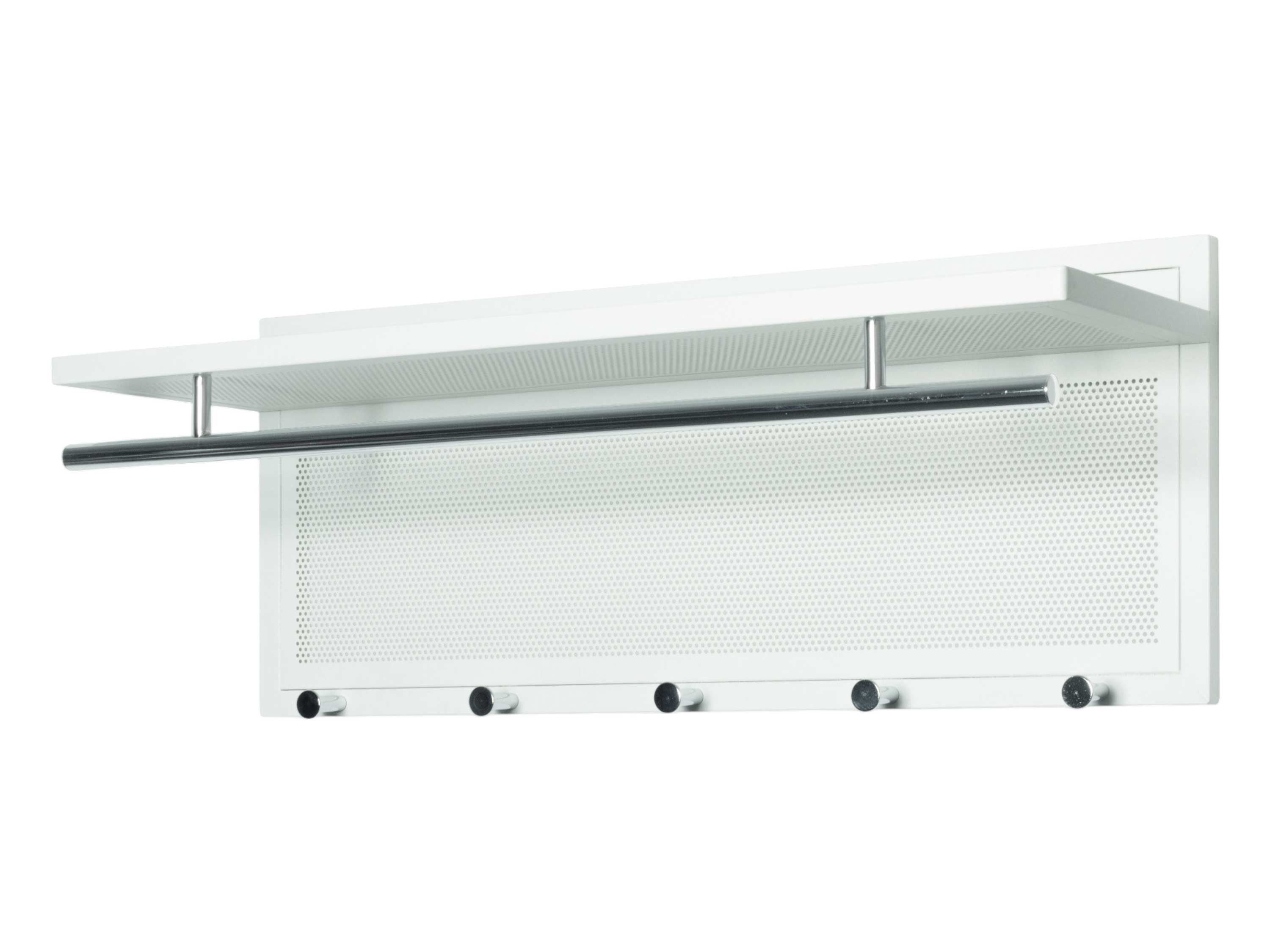 Diese moderne Wandgarderobe überzeugt mit ihrem funktionalen Design und klaren Linien. Die Rückwand und Ablage bestehen aus weiß pulverbeschichtetem Metall mit dekorativem Lochdesign. Die verchromte Kleiderstange bietet auf 73 cm Breite viel Platz für Jacken, Mäntel oder Kleiderbügel. Fünf stabile Haken aus verchromtem Stahlrohr sorgen für zusätzlichen Stauraum für Taschen, Schals oder Hüte.