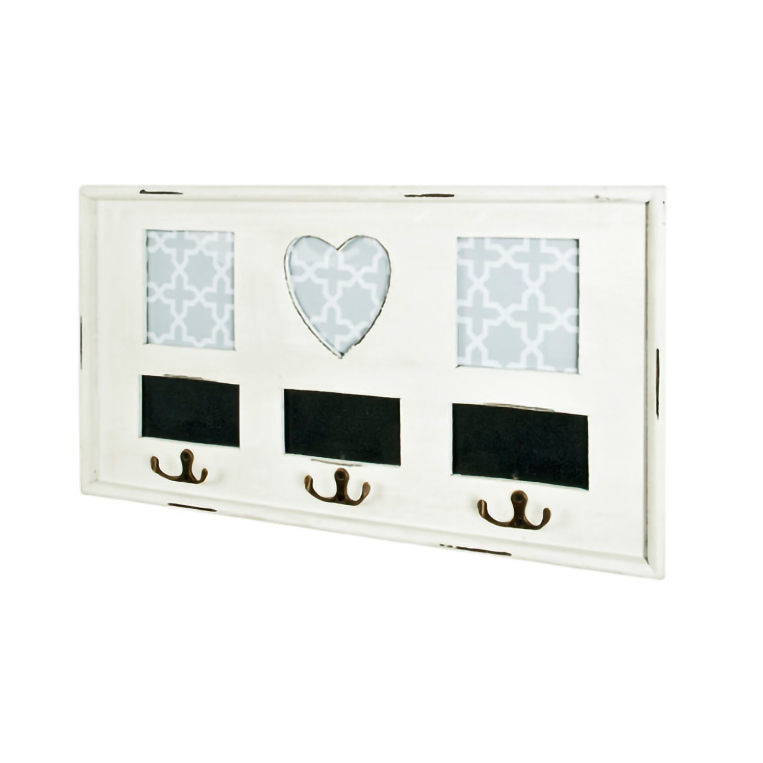 Wandgarderobe aus Massivholz/MDF in antikweiß lackiert, mit 3 Garderobenhaken und eingelassenen Bilderrahmen mit Beschriftungsmöglichkeit