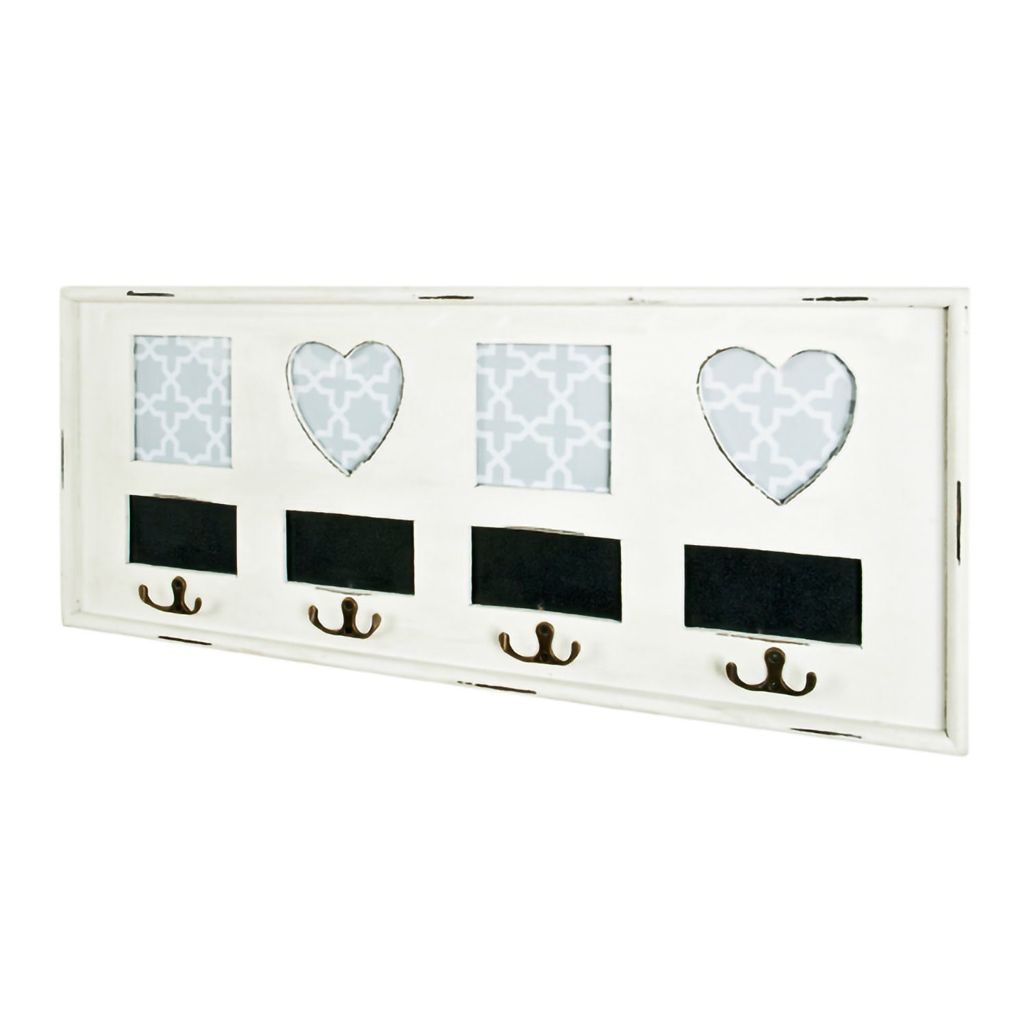 Wandgarderobe aus Massivholz/MDF in antikweiß lackiert, mit 4 Garderobenhaken und eingelassenen Bilderrahmen mit Beschriftungsmöglichkeit
