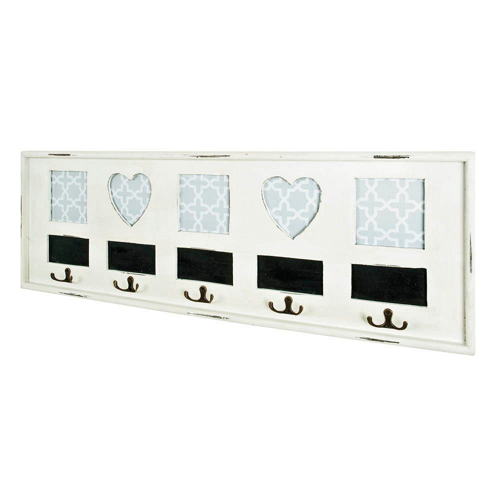 Wandgarderobe aus Massivholz/MDF in antikweiß lackiert, mit 5 Garderobenhaken und eingelassenen Bilderrahmen mit Beschriftungsmöglichkeit
