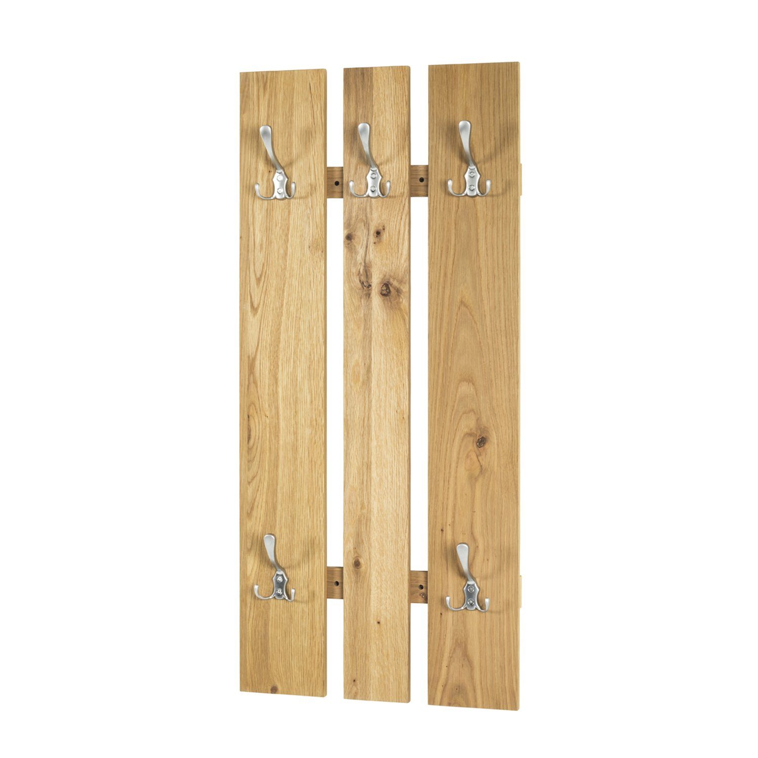 Diese Wandgarderobe kann in die unterschiedlichsten Wohnkonzepte integriert werden. Durch das verwendete Eichenholz schafft dieses Möbelstück eine natürliche Atmosphäre. Fünf Haken bieten Platz für Jacken, Mäntel und Schals.