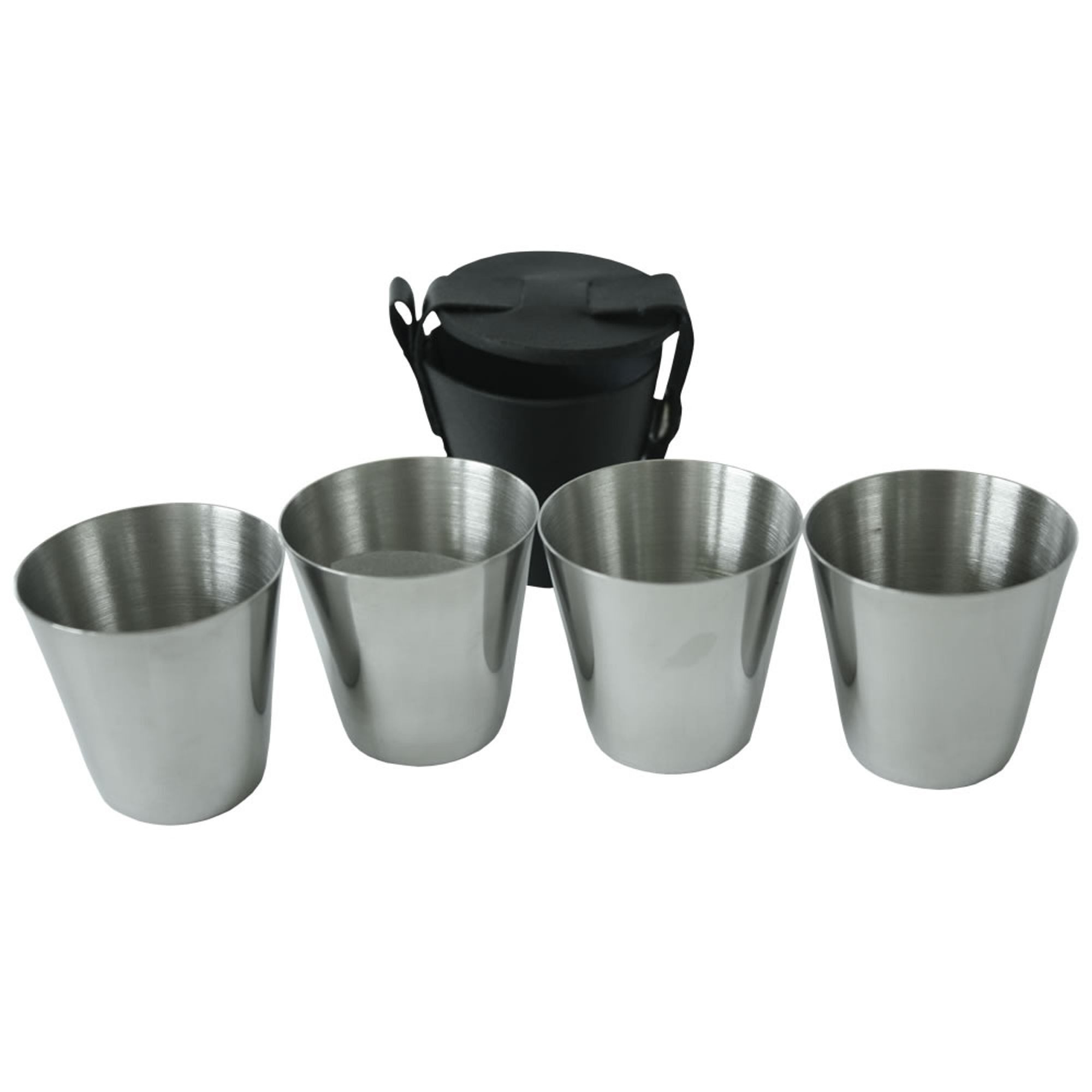 Set bestehend aus vier Bechern im Etui, aus rostfreiem Stahl.