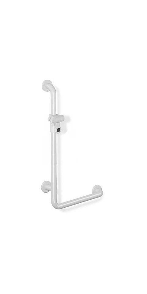 HEWI Winkelgriff m.Br.H.Stg. Serie 801 A1:1100 W1:600 reinweiß HEWI Winkelgriff m.Br.H.Stg. Serie 801 A1:1100 W1:600 reinweiß Winkelgriff mit Brausehalter der Serie 801 - senkrecht und waagerecht angeordnete, im rechten Winkel verbundene Stangen mit Befestigungsrosetten und Brausehalter - ergonomisch und funktional in einer einfachen und zeitlosen Formensprache gestaltet - geeignet für Handbrausen verschiedener Hersteller - Brausehalter kann stufenlos geneigt und nach Ziehen oder Drücken eines großflächigen Hebels in der Höhe verstellt werden - konische Aufnahme am Brausehalter erleichtert das Einhängen der Handbrause - mit durchgehendem, korrosionsgeschütztem Stahlkern - Montage an der Wand mit wandspezifischem Befestigungsmaterial und Rosetten von HEWI - links- und rechtsseitig montierbar - leicht zu reinigen - senkrechte Длина 1100 mm, waagerechte Длина 600 mm, 90 mm tief, Stangendurchmesser 33 mm, Rosettendurchmesser 70 mm - für Einhängesitz geeignet - aus hochwertigem Polyamid in den HEWI Farben