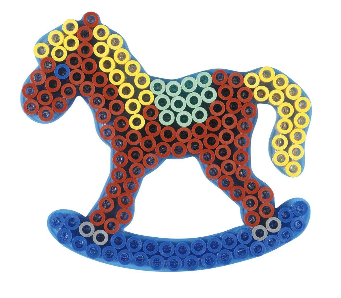 Die bunten Perlen lassen sich nach Vorlage oder ganz frei nach eigenen Vorstellungen auf die Stiftplatte stecken, wodurch farbenfrohe Motive oder sogar Mandalas entstehen. Der Fantasie sind durch die vielen verschiedenen Plattenmotive keine Grenzen gesetzt. Die Stifplatte von HAMA ist transparent und in From eines Schaukelpferds.