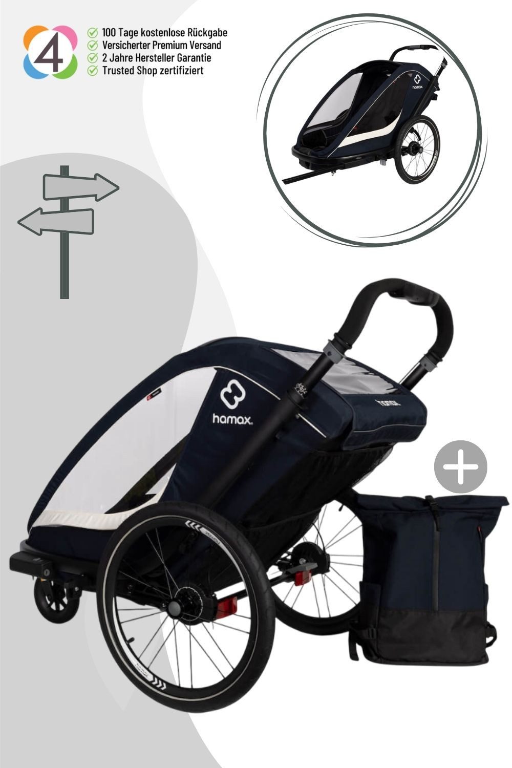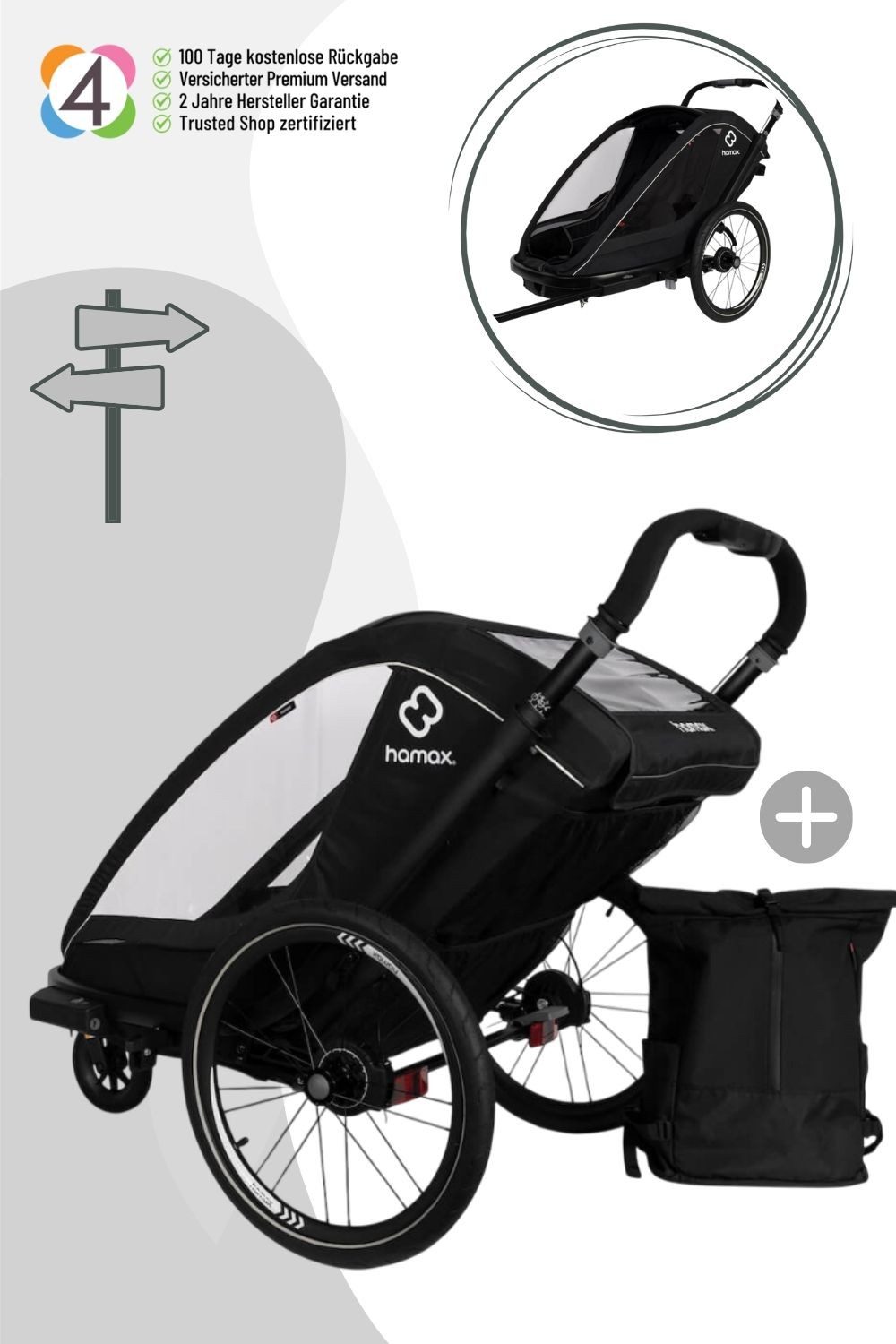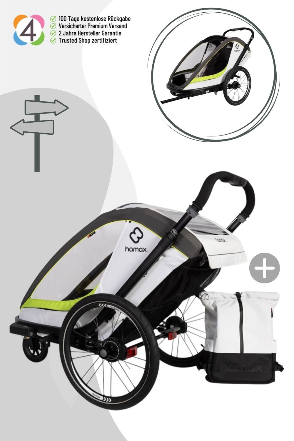 Ich bin der Hamax Breeze Kinderfahrradanhänger und überzeuge Euch mit meinem sportlichen Look und meiner komfortablen Innenausstattung. Ich bin ideal für Familienausflüge, sei es beim Spaziergang, auf einer Radtour oder sogar bei einer Joggingrunde (separates Zubehör erforderlich). Dank meiner smarten technischen Eigenschaften bin ich benutzerfreundlich, sicher und bequem. Meine einzeln verstellbaren Rückenlehnen sorgen für den individuellen Komfort Eurer Kinder, während meine integrierte Handbremse ein sicheres Bremsen, besonders auf unebenem Gelände, ermöglicht. Ein abnehmbarer Rucksack macht mich auch im Alltag praktisch nutzbar und mein integriertes Regenverdeck schützt Eure Kleinen bei schlechtem Wetter. Mit meinem Buggyrad mit Twistfunktion ist es ein Leichtes zwischen Fahrrad- und Buggy-Modus zu wechseln. Meine innovative Falttechnik ermöglicht Euch ein müheloses Zusammenklappen und Transportieren, während mein verstellbarer Schiebegriff mit softem Schaumstoff-Überzug für angenehmes Schieben sorgt. Bequeme Sitz-Polster und einstellbare Federung bieten Euren Kindern eine angenehme Fahrt, und meine hochwertigen Reifen mit Hamax-Design sorgen für eine gute Performance. Zusätzlich bietet meinem tiefen Schwerpunkt hohe Stabilität und Sicherheit, damit die Familienausflüge mit mir als Begleiter zu einem rundum gelungenen Erlebnis werden.