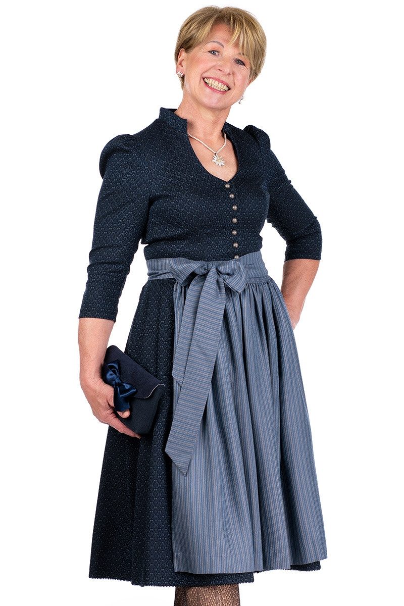 Dieses herrliche Midi Winter Dirndl "Weitsee" in Marine besticht durch das filigrane Jacquard-Webmuster und die halblangen Ärmel. Das zarte Design zeigt Blümchen in Hellblau und Grau auf einem marine-farbenen Hintergrund. Für optimalen Tragekomfort wurde das Dirndlkleid leicht stretchig verarbeitet und die Stoffqualität sorgt für ein behagliches Tragegefühl. Das Mieder ist sauber abgefüttert und tailliert mit Wiener Naht geschnitten. Die angesagten, halblangen Puffärmel und der stilvolle Kragen, kombiniert mit einem kleinen, abgerundeten V-Ausschnitt, ergänzen das elegante Erscheinungsbild. Die altsilbernen Ösenknöpfe mit zartem, floralem Ornamentik-Motiv setzen weitere Akzente. Der wadenlange Rock ist in Kellerfalten gelegt und beidseitig mit Eingrifftaschen ausgestattet. Den Rocksaum ziert eine süße Schlaufenborte. Die Dirndlschürze ist dezent glänzend und zeigt ein erlesenes Webmuster in Jeansblau und Hellgrau aus Streifen in zwei Breiten. Der Bund ist gehanselt und der Saum gerade geschnitten. Das Dirndl kann hervorragend ohne Bluse getragen werden. Im Lieferumfang sind das Dirndl und die Schürze enthalten, eine Bluse ist nicht inbegriffen. Bitte beachten Sie Größenzuschläge ab Размер 48.