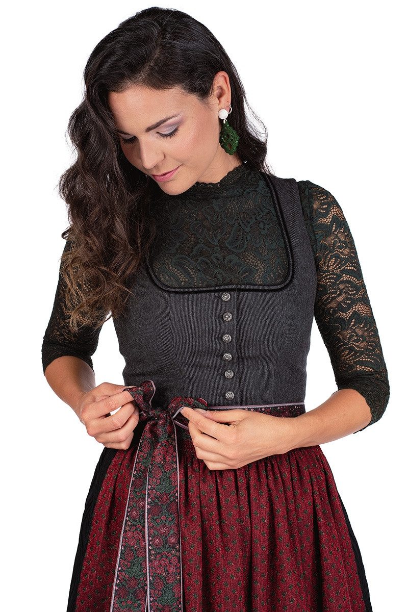 Mit diesem stilvollen, hochwertigen Midi Dirndl "Pillersee" in Grau/Schwarz/Rot wird frau zum Eyecatcher auf jeder Veranstaltung. Das erlesene, tailliert geschnittene, sauber abgefütterte Mieder hat ein feines Linien-Webmuster in Grau/Schwarz, einen beidseitig abgerundeten Balconette-Ausschnitt, der mit Kontraststoff abgepaspelt sowie mit einer feinen Samtborte in Schwarz umrahmt ist, und eine Knopfleiste mit schmucken, altsilbernen Ösenknöpfen im floralen Ornamentik-Stil. Der grandiose, wadenlange Rock mit der raffinierten Webstruktur im 3D-Look aus feinen, erhabenen, wellenförmigen Biesen verfügt beidseitig über Eingrifftaschen. Zum Dirndl wird das herrliche Trachtenkleid durch die fantastische, zart glänzende Schürze in Jacquard-Art mit dem rustikal angehauchten Webmuster in Rot/Schwarz, ergänzt durch zauberhafte, florale Ornamente in Grün. Am Bund ist sie gehanselt, der Saum ist gerade und gehalten wird die Dirndlschürze durch das breite, folkloristisch gestaltete Schürzenbindeband mit dem floralen, mehrfarbigen Webmuster. Im Lieferumfang sind das Dirndl und die Schürze enthalten; eine Bluse ist nicht inbegriffen. Bitte beachten Sie die Größenzuschläge ab Размер 48.
