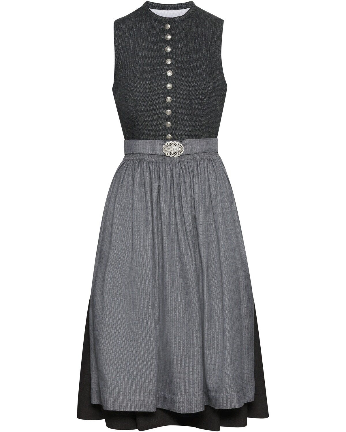 Das hochgeschlossene Midi Dirndl Attersee von Hammerschmid vereint traditionelle Eleganz mit modernem Komfort. Das Mieder, gefertigt aus einem hochwertigen Schurwollmix, besticht durch einen stilvollen Stehkragen und eine Knopfleiste, die mit altsilberfarbenen Metallknöpfen versehen ist. Diese Details verleihen dem Dirndl eine besondere Note und unterstreichen die hohe Qualität. Der Rock besteht aus fließender Viskose, die nicht nur angenehm zu tragen ist, sondern auch durch ihre Beweglichkeit überzeugt. Mit einem eleganten Faltenwurf und zwei praktischen Seitentaschen kombiniert das Dirndl Funktionalität mit einem femininen Look. Die harmonische Farbgebung sorgt dafür, dass das Kleid sowohl zu festlichen Anlässen als auch im Alltag getragen werden kann. Die farblich abgestimmte Schürze rundet das Gesamtbild ab und setzt mit feinen Streifen und einer eleganten Metallschließe zusätzliche Akzente. Dieses Dirndl ist die perfekte Wahl für alle, die Wert auf stilvolle Tradition und zeitgemäßen Chic legen. Ideal für Festlichkeiten, aber auch für besondere Anlässe im Alltag, bietet das Midi Dirndl Attersee von Hammerschmid eine gelungene Kombination aus Komfort und Ästhetik. Oberstoff: 56% Schurwolle, 18% Polyester, 14% Baumwolle, 12% Polyacryl; Futter: 100% Baumwolle; Sonstige Materialien: 100% Viskose (Rock), Schürze, 60% Viskose, 40% Polyester