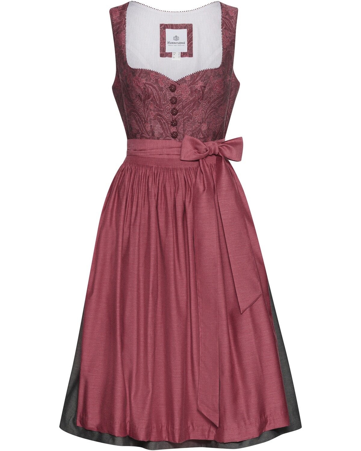 Das Midi Dirndl Rothsee von Hammerschmid vereint traditionelle Eleganz mit modernem Chic. Das edle Mieder besticht durch ein kunstvolles Jacquard-Muster und einen ansprechenden Herzausschnitt, der mit einer zarten Borte verziert ist. Die durchgehende Knopfleiste in der vorderen Mitte sorgt für einen zusätzlichen Blickfang und unterstreicht die feine Verarbeitung des Dirndls. Der farblich abgesetzte Rock aus hochwertiger Baumwolle bietet nicht nur einen hohen Tragekomfort, sondern auch eine ansprechende Silhouette. Mit seinen eleganten Falten und zwei praktischen Taschen seitlich vereint das Design Funktionalität und Stil. Die harmonische Farbgestaltung des Rocks ergänzt das Mieder perfekt und schafft ein stimmiges Gesamtbild. Die edel schimmernde Schürze rundet das Ensemble ab und verleiht dem Midi Dirndl Rothsee einen festlichen Touch. Ideal für besondere Anlässe oder traditionelle Feierlichkeiten, strahlt dieses Dirndl sowohl Femininität als auch Stilbewusstsein aus. Ein zeitloses Kleidungsstück, das in keiner Garderobe fehlen sollte. Oberstoff: 65% Polyester, 35% Baumwolle; Futter: 100% Baumwolle; Sonstige Materialien: 100% Baumwolle (Rock), Schürze, 50% Viskose, 50% Polyester