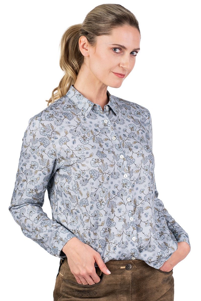 Die Trachtenbluse "Gerda" im Hemdblusen-Schnitt mit langen Ärmeln besteht aus luftig-leichter, fließender Viskose in Twill-Art und hat eine tolle, weiche Haptik. Für einen Eyecatcher sorgt das fantastische Printmuster, das aus kunstvoll gestalteten Blumen-Arrangements besteht. Die Blüten sind in harmonischen Blau-, Grau- und Weiß-Tönen gestaltet, die Blätter in Oliv sowie Hellgrün und der Untergrund erstrahlt in einem zarten Hellblau. Die leicht taillierte Passform wird durch Wiener Nähte und Abnäher im Brustbereich betont, die eine ideale Silhouette schaffen. Der schmale Kentkragen sowie die Knopflochleiste sind verstärkt und die Knopfleiste ist mit schimmernden Perlmuttknöpfen besetzt, die für einen edlen Akzent sorgen. Die bequemen, langen Ärmel enden in schmalen, geraden Manschetten, die ebenfalls verstärkt sind. Der leicht abgerundete Saum rundet das Gesamtbild dieser Damenbluse ab, die sich zauberhaft mit Trachtenjeans oder Lederhosen kombinieren lässt. Ab Размер 48 sollten Größenzuschläge berücksichtigt werden.