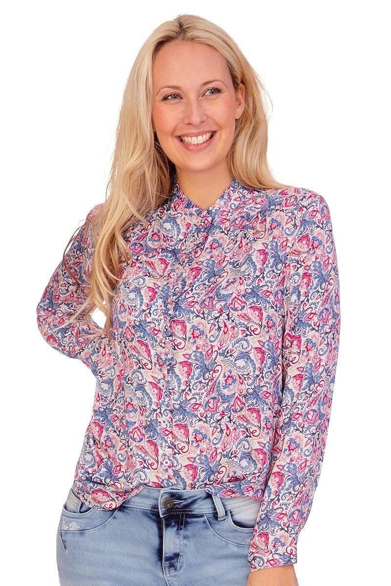 Die bezaubernde langarm Trachtenbluse Vera stammt aus dem Hause Hammerschmid und lässt sich perfekt zu Lederhose, Trachtenrock und -jeans kombinieren. Sie ist leicht tailliert sowie lässig geschnitten, besteht aus luftig-weicher Viskose, hat eine tolle, leichte Stoffqualität mit angenehmer Haptik und bietet einen super Tragekomfort. Das grandiose allover Printmuster aus floralen Ornamentik-Motiven in Pink und Blau wird durch grüne Details akzentuiert. Der schicke Stehkragen ist oben mit einer niedlichen Raffrüsche verziert, die bis zur Mitte der Knopflochleiste geht. Die Schulterpartien sind dezent abgesetzt und darunter jeweils vorn sowie hinten für eine tolle Passform teils dezent gerafft. Traumhaft glänzende Knöpfe im Perlmutt-Look zieren die Knopfleiste und die leicht verstärkten, schmalen Manschetten der langen Ärmel. Der Saum der fantastischen Damenbluse ist stark abgerundet und hinten etwas länger. Bitte beachten Sie den Größenzuschlag ab Размер 48.