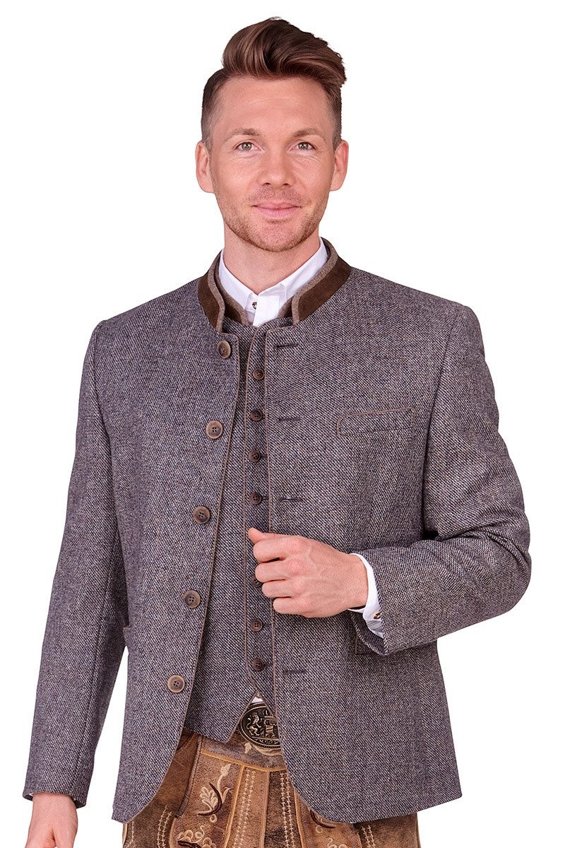 Dieser kernige, leicht taillierte Trachtenjanker namens Werner in Taupe kommt aus dem Hause Hammerschmid und macht Ihr Lederhosen-Outfit perfekt. Er besteht aus feiner Schurwolle, hat eine angenehm weiche Haptik und ein krachiges Webmuster in Twill-Art aus Garnen in drei Farben. Den schicken, leicht kontrastfarbenen Stehkragen aus fein gewalktem Webstoff schmückt unten eine urige, breite Lederborte. Die Knopfleiste zieren tolle Knöpfe in rustikaler Holz-Optik. Sowohl die eingearbeitete Brusttasche links als auch die zwei Eingrifftaschen vorn sind mit breiten Paspeln im Patten-Look aus Jackenstoff gearbeitet. Zudem sind die Patten innen mit Walkstoff verstärkt, der außen als schmale Paspel sichtbar ist. In das angenehme Innenfutter im feinen Streifen-Look sind beidseitig je eine Innentasche eingearbeitet - die linke mit Knopf. Bitte beachten Sie die Größenzuschläge ab Размер 58.