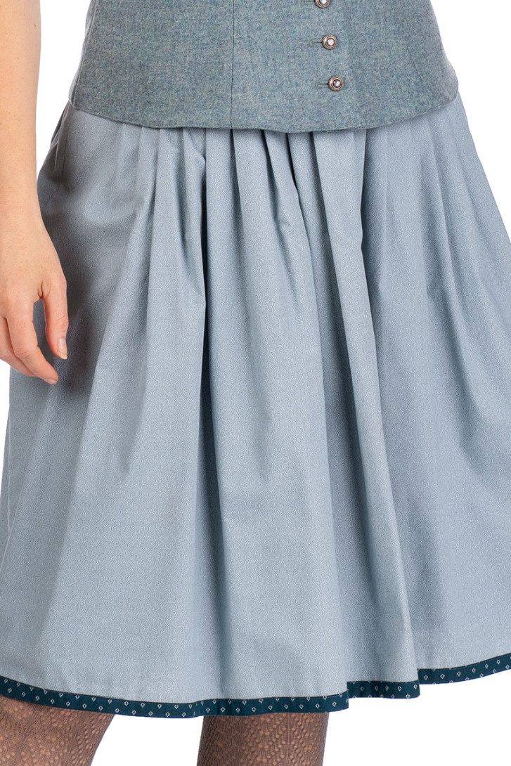 Dieser exquisite Trachtenrock "Passau" für Damen in knieumspielender Длина präsentiert sich in ausgestellter A-Linie. Der modische, breite Bund im melangierten Loden-Style, gefertigt aus Wolle mit Stretch-Anteil, hat innen mit Rockstoff als Verstärkung und links einen verdeckten Reißverschluss. Den in schmale Kellerfalten gelegten Rockteil aus reiner, angenehmer Baumwolle ziert allover ein zartes, konturiertes Ornamentik-Printmuster und beidseitig sind Eingrifftaschen eingearbeitet. Der Rockabschluss ist mit einer Kontraststoffborte in Tannegrün besetzt, die mit einem stilisierten Blümchen-Print verziert ist. Ein Unterrock in Taft-Art sorgt für hervorragenden Tragekomfort. Dieser Rock passt wunderbar zu einer Trachtenbluse, einem Blusenbody oder einem Spitzenshirt. Beachten Sie bitte bei Размер 48 den Größenzuschlag.