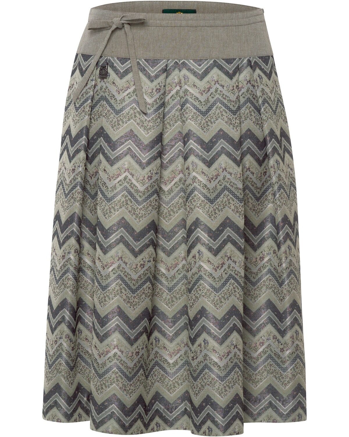 Der Midi Trachtenrock Weiden von Hammerschmid begeistert mit einem ansprechenden Zick-Zack-Muster, das ihm eine moderne Note verleiht und gleichzeitig die traditionellen Elemente der Trachtenmode aufgreift. Die kunstvoll eingearbeiteten Falten sorgen für eine feminine Silhouette und verleihen dem Rock eine elegante Bewegung, die sowohl im Alltag als auch bei festlichen Anlässen zur Geltung kommt. Ein besonderer Blickfang ist der Formbund aus Kontraststoff, der dem Rock nicht nur einen stilvollen Akzent verleiht, sondern auch für einen angenehmen Sitz sorgt. Der harmonische Farbwechsel zwischen dem Zick-Zack-Muster und dem Bund unterstreicht die Raffinesse des Designs und macht den Midi Trachtenrock zu einem vielseitigen Kombinationspartner für verschiedene Oberteile. Der praktische Reißverschluss in der Seitennaht ermöglicht ein unkompliziertes An- und Ausziehen und sorgt für zusätzlichen Komfort. Ob kombiniert mit einer klassischen Bluse oder einem modernen Top, dieser Trachtenrock ist die ideale Wahl für modebewusste Frauen, die Tradition und zeitgemäßen Stil miteinander verbinden möchten. Oberstoff: 80% Polyester, 20% Viskose; Sonstige Materialien: Besatz, 52% Baumwolle, 25% Leinen, 20% Polyester, 3% Elasthan