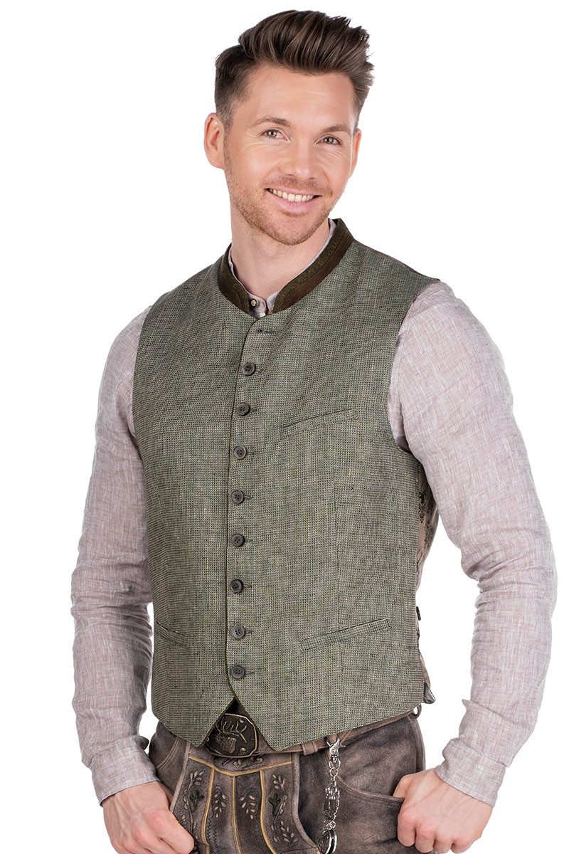 Ein krachig-stilvolles Meisterstück ist die leicht tailliert im Slim Fit-Schnitt gearbeitete Herren Trachtenweste "Conrad". Das Gilet hat eine rustikal angehauchte Vorderseite aus Leinen in zünftiger Leinwandbindung-Art in Trachtengrün/Beige, einen glanzvollen Rücken aus herrlich gemustertem Jacquard, einen schicken Stehkragen und urige Knöpfe aus echtem Horn-Material. Den Kragen aus Leinen in dunklerem Trachtengrün ziert ein kerniger Besatz im Veloursleder-Style in Braun. Sowohl die Brusttasche links als auch die Eingrifftaschen sind jeweils mit einer breiten Paspel gestaltet, Knopf- sowie Knopflochleiste mit Leinenstoff in dunklem Trachtengrün abgepaspelt. Der edle, fein changierende Jacquard-Westenrücken zeigt ein fantastisch arrangiertes Webmuster aus floralen Ornamenten, Ranken und stilisierten Hirschköpfen in Trachtengrün auf beigefarbenem Untergrund und verfügt über einen verstellbaren Riegel aus Rückenstoff mit einer mattsilbernen Schnalle für den optimalen Sitz. Das angenehme, leicht glänzende Futter im Streifen-Design sorgt für einen tollen Tragekomfort und links gibt es eine Innentasche. Bitte beachten Sie den Größenzuschlag ab Размер 58.