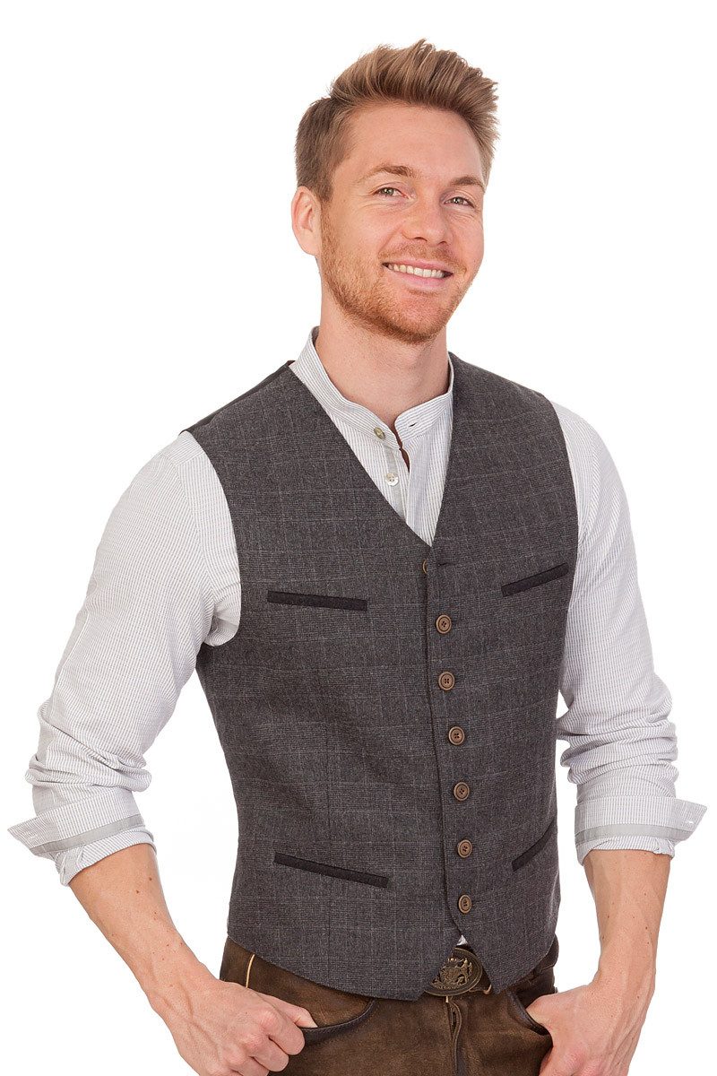 Die exklusive Trachtenweste Gerold mit hohem Woll-Anteil und Knopfleiste ist eine grandiose Kreation der Trachtenmarke Hammerschmid und lässt sich prima zu Lederhosen und Trachtenjeans kombinieren. Vorderteil und Seiten des Gilets haben ein wundervolles Karo-Webmuster im Glencheck-Stil, der glanzvolle Westenrücken besteht aus schwarzem Satin. Knopf- und Knopflochleiste sind mit Walkstoff verstärkt und die beiden Brusttaschen sowie Seitentaschen mit Paspeln aus Walk betont. Die herrlichen Knöpfe aus Horn-Material haben eine edle Holz-Optik. Für den optimalen Sitz sorgt der Rückenriegel aus Glencheck-Stoff mit der silbernen Schnalle. Das glänzende Innenfutter in edlem Rot mit niedlichen Hirsch-Motiven garantiert einen tollen Tragekomfort. Linksseitig gibt es eine Innentasche. Bitte beachten Sie die Übergrößenzuschläge ab Размер 58. Der passende Janker Gustav ist hier ebenfalls erhältlich.