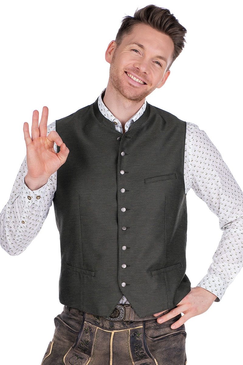 Die geschmackvolle Trachtenweste "Korbinian" mit Stehkragen für Herren hat allover ein festliches Webmuster im Jacquard-Look aus klitzekleinen, dezent glänzenden Rauten in hellem Oliv auf einem Untergrund in dunklem Oliv und ist tailliert im Slim Fit-Schnitt gearbeitet. Silberne Ösenknöpfe im feinen, floralen Ornamentik-Design zieren die Knopfleiste. Links gibt es eine Brusttasche und beidseitig Eingrifftaschen - jeweils mit einfacher Paspel. Der Rücken ist für einen optimalen Sitz mit einem verstellbaren Riegel mit altsilberner Schnalle versehen und für einen angenehmen Tragekomfort sorgt das leicht glänzende Futter in Schwarz; zudem besitzt das Gilet links eine Innentasche. Beachten Sie bitte ab Размер 58 die Größenzuschläge.
