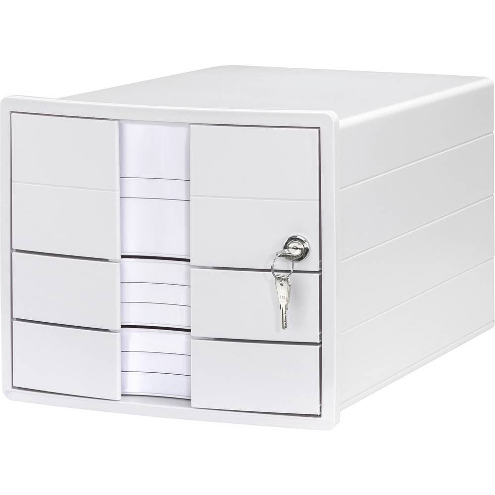 Schubladenbox IMPULS mit modernem Gehäusedesign. Mit 3 geschlossenen Schubladen (2 x Standard, 1 x extrahoch inkl. Schloss) für Papierformate DIN A4/C4. Innovatives, attraktives Design in höchster Qualität. Inkl. auswechselbarer Beschriftungsschilder mit hochwertiger Klarsichtabdeckung für ein einfaches Auffinden von Unterlagen. Leichtlaufende Schubladen mit Auszugssperre und durchgängig geschlossenem Boden. Extra stabile Gehäuseausführung mit optimierter Stapeltechnik. Rutschfeste, möbelschonende Gummifüße sorgen für einen sicheren Stand. Inkl. innovativem Schubladeneinsatz mit 6 unterschiedlich großen Fächern und Griff, der auch perfekt auf die Box mit der integrierten Stapelrippe gestellt werden kann. Die obere, extrahohe Schublade ist mit einem Zylinderschloss versehen und dadurch abschließbar. 2 Schlüssel sind im Lieferumfang enthalten. Ideal für die Aufbewahrung von vertraulichen Informationen und persönlichen Gegenständen. Made in Germany. Außenmaße (B x T x H): 280 x 367 x 235 mm. Innenmaße der Standard Schubladen (B x T x H): 240 x 325 x 37 mm, Innenmaß der extrahohen Schublade (B x T x H): 240 x 325 x 95 mm, daher ein hohes Fassungsvolumen. Material: hochwertiger Kunststoff, Polystyrol (PS). Farbe des Gehäuses: weiß. Farbe der Schubladen: weiß. Farbe des Schubladeneinsatzes: transparent-glasklar..