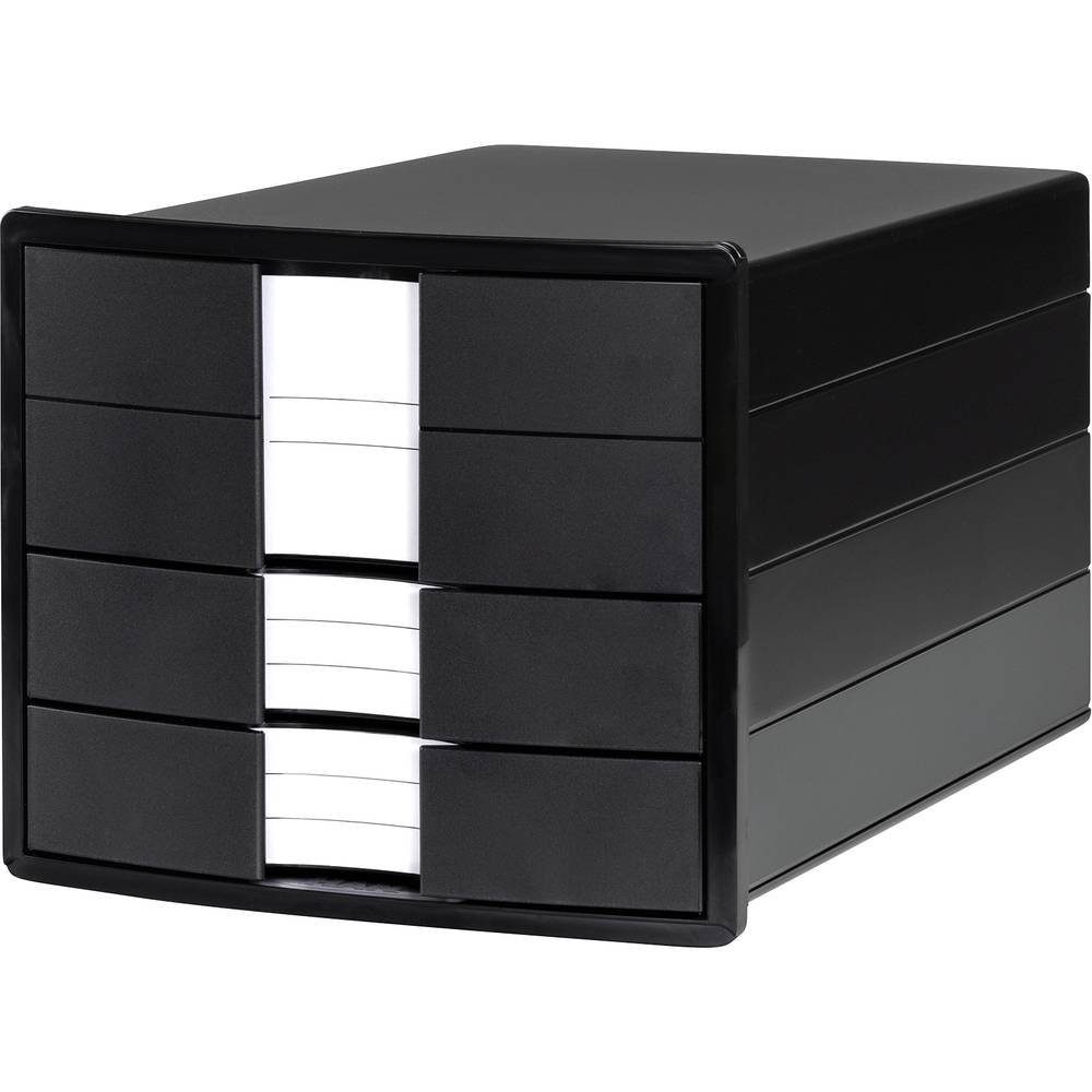 Schubladenbox IMPULS mit modernem Gehäusedesign. Mit 3 geschlossenen Schubladen (2 x Standard, 1 x extrahoch) für Papierformate DIN A4/C4. Innovatives, attraktives Design in höchster Qualität. Inkl. auswechselbarer Beschriftungsschilder mit hochwertiger Klarsichtabdeckung für ein einfaches Auffinden von Unterlagen. Leichtlaufende Schubladen mit Auszugssperre und durchgängig geschlossenem Boden. Extra stabile Gehäuseausführung mit optimierter Stapeltechnik. Rutschfeste, möbelschonende Gummifüße sorgen für einen sicheren Stand. Inkl. innovativem Schubladeneinsatz mit 6 unterschiedlich großen Fächern und Griff, der auch perfekt auf die Box mit der integrierten Stapelrippe gestellt werden kann. Made in Germany. Außenmaße (B x T x H): 280 x 367 x 235 mm. Innenmaße der Standard Schubladen (B x T x H): 240 x 325 x 37 mm, Innenmaß der extrahohen Schublade (B x T x H): 240 x 325 x 95 mm, daher ein hohes Fassungsvolumen. Material: hochwertiger Kunststoff, Polystyrol (PS). Farbe des Gehäuses: schwarz. Farbe der Schubladen: schwarz. Farbe des Schubladeneinsatzes: schwarz..