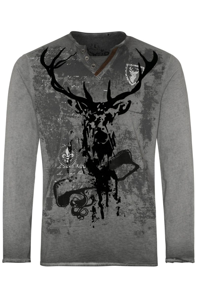 Das zünftig-modische Herren Longsleeve namens Elvis, eine tolle Kreation aus der Trachtenschmiede Hangowear, besteht aus reiner, angenehmer Baumwolle und hat einen feinen Melange-Look mit dezenten Oil-Washed-Effekten. Der Rundhals-Part des angesagten Serafino-Ausschnitts ist mit einer feschen, offenen Kante betont und der V-Ausschnitt mit schicken, altsilbernen Knöpfen bzw. einer Borte im Velours-Stil dekoriert. Das Highlight des Langarmshirts ist der grandiose, große Flock-Print in Hirschkopf-Form, ergänzt durch Text, ein Wappen mit Hirschkopf, eine Königslilie und ein Banner als Aufdruck sowie ein grungig gedruckter Hintergrund, auf der Vorderseite. Ein weiteres keckes Detail ist der gedruckte Schriftzug "Servus oide Wurschthaut" innenseitig vorn über dem Saum. Die rechte Schulter hinten zieren ein Banner mit Markenname, ein Zitat, ein Wappen und ein Grunge-Element als Print. Sowohl die Bündchen der langen Ärmel als auch der Saum sind mit trendy offenen Kanten gestaltet. Der gerade Schnitt und das weiche Material bieten einen super Tragekomfort. Das Longsleeve für Herren passt mega zur Lederhose und Trachtenjeans.