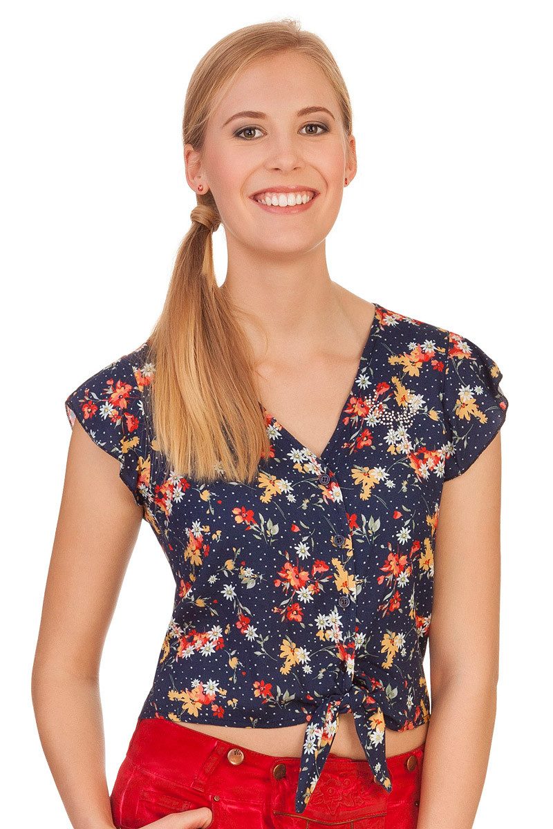 Die luftige Damenbluse Roxy ist allover mit tollen Blüten und Pünktchen im Retro-Design bedruckt Sie hat süße angeschnittene Flügelärmelchen in Form von Volants und einen tiefen V-Ausschnitt, der in die Knopfleiste übergeht. Unterhalb der mit dezent schimmernden Knöpfen bestückten Knopfleiste ist die zarte, figurumschmeichelnde Trachtenbluse zipfelförmig verlängert und wird zu einem dekorativen Knoten gebunden. Auf der linken Brust und rückseitig im Nackenbereich befindet sich je ein niedliches Hirschkopf-Motiv aus funkelnden Glanznieten. Der Saum ist abgerundet und hinten etwas länger. Hinten links über dem Saum ziert ein kleiner Marken-Print die zauberhafte Sommerkreation von der Marke hangOwear, die super zur Lederhose und Trachtenjeans passt.