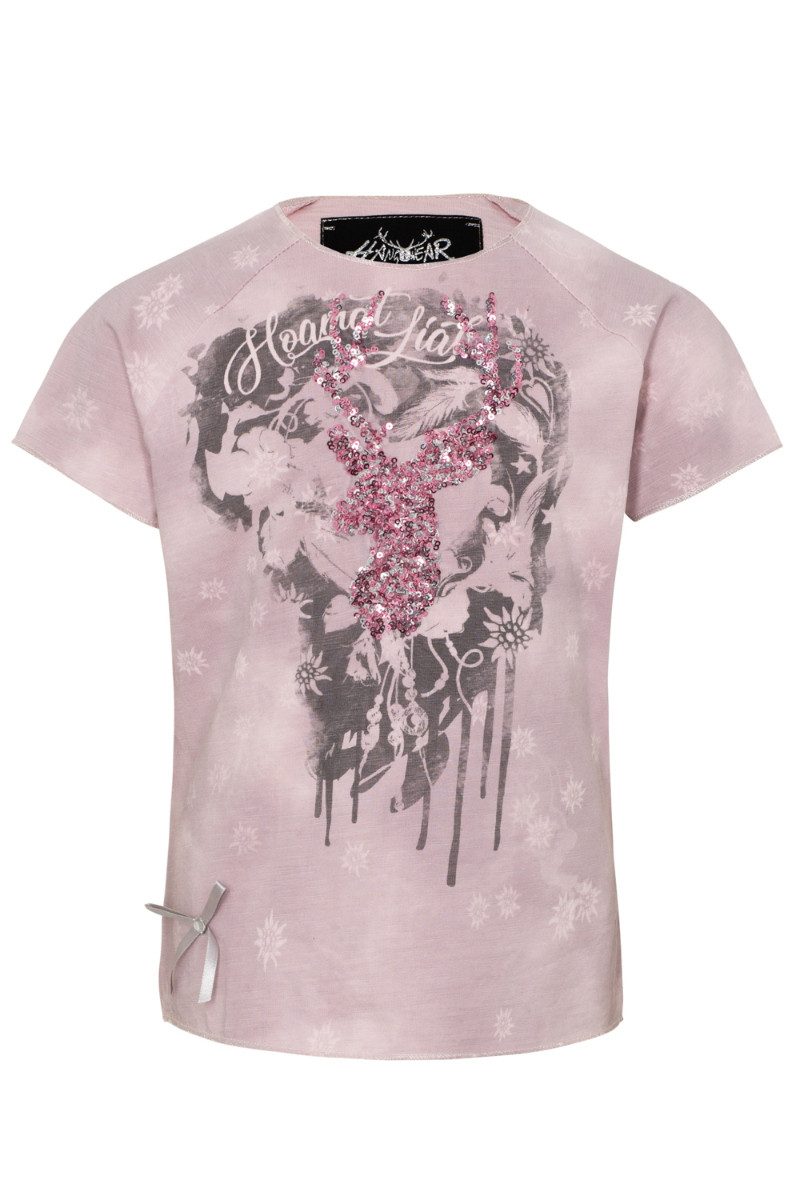 Dieses zauberhafte Trachtenshirt für Kinder mit kurzen Ärmeln in Raglan-Art besteht aus reiner Baumwolle in Flammgarn-Optik und ist leicht tailliert geschnitten. Der Rundhals-Ausschnitt, die Ärmelenden sowie der Saum sind umnäht und mit Lurex veredelt. Das Mädchen-Shirt im feinen Wolken-Look ist allover mit zarten Edelweiß-Blüten und die Vorderseite zusätzlich mit einem verlaufenden Grunge-Element, ergänzt durch Federn, ein Herz, Perlenschnüre und dem Schriftzug "Hoamat Liab" oben, bedruckt. Auf dem Print ziert ein wundervoller, großer Hirschkopf aus funkelnden Pailletten in zwei Farben das verträumte Kindershirt. Komplettiert wird das bezaubernde Design von der Trachtenmarke HangOwear durch ein kleines Satin-Schleifchen mit Strassstein vorn rechts über dem Saum und den Marken-Print aus Glimmer hinten links über dem Saum.