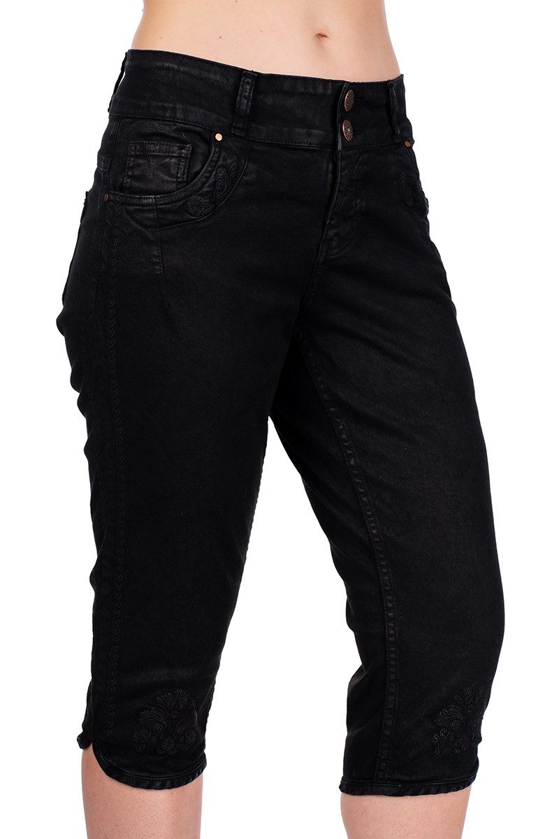 Diese stylisch-edle Trachtenjeans "Hendrina KB" in Schwarz für Damen präsentieren sich in einer Kniebund-Длина und im Five-Pocket-Stil. Sie wird aus feiner Baumwolle mit einem Stretch-Anteil gefertigt und glänzt partiell dezent. Der breite Bund mit Gürtelschlaufen sorgt für optimalen Halt und ist vorne mit zwei Knöpfen sowie einem verdeckten Reißverschluss zu schließen. Die altkupferfarbenen Knöpfe sind mit einem feinen Ornamentik-Motiv verziert. Zwei Eingrifftaschen vorne sowie eine kleine Uhrentasche rechts bieten ausreichend Stauraum. Die Tascheneingriffe vorne sind floral bestickt und mit kupferfarbenen Ziernieten versehen, wobei die linke Tasche zusätzlich mit einer floralen Ornamentik-Stickerei über dem Tascheneingriff verziert ist. Besondere Akzente setzen die äußeren Seitennähte, die beidseitig mit einer gestickten Zierlinie aus Rauten betont sind. Märchenhafte, florale Ornamentik-Stickereien schmücken die Vorderseite der Hosenbeine im unteren Bereich. Der Beinabschluss ist umsäumt und an der Außenseite dezent geschlitzt. Hinten rechts am Bund befindet sich ein Marken-Aufnäher im Leder-Look. Über der Hosensattel-Naht ziehen entzückende, florale Stickereien die Blicke auf sich. Zwei aufgesetzte Taschen hinten sind mit Ziernieten und feschen Falten versehen. Все Stickereien sind Ton-in-Ton gehalten. Der hohe Tragekomfort dieser Jeans wird durch den Stretch-Anteil gewährleistet. Sie passt wunderbar zu einer Trachtenbluse, einem -Shirt, einem Mieder oder einem Hoodie und ist somit vielseitig kombinierbar.