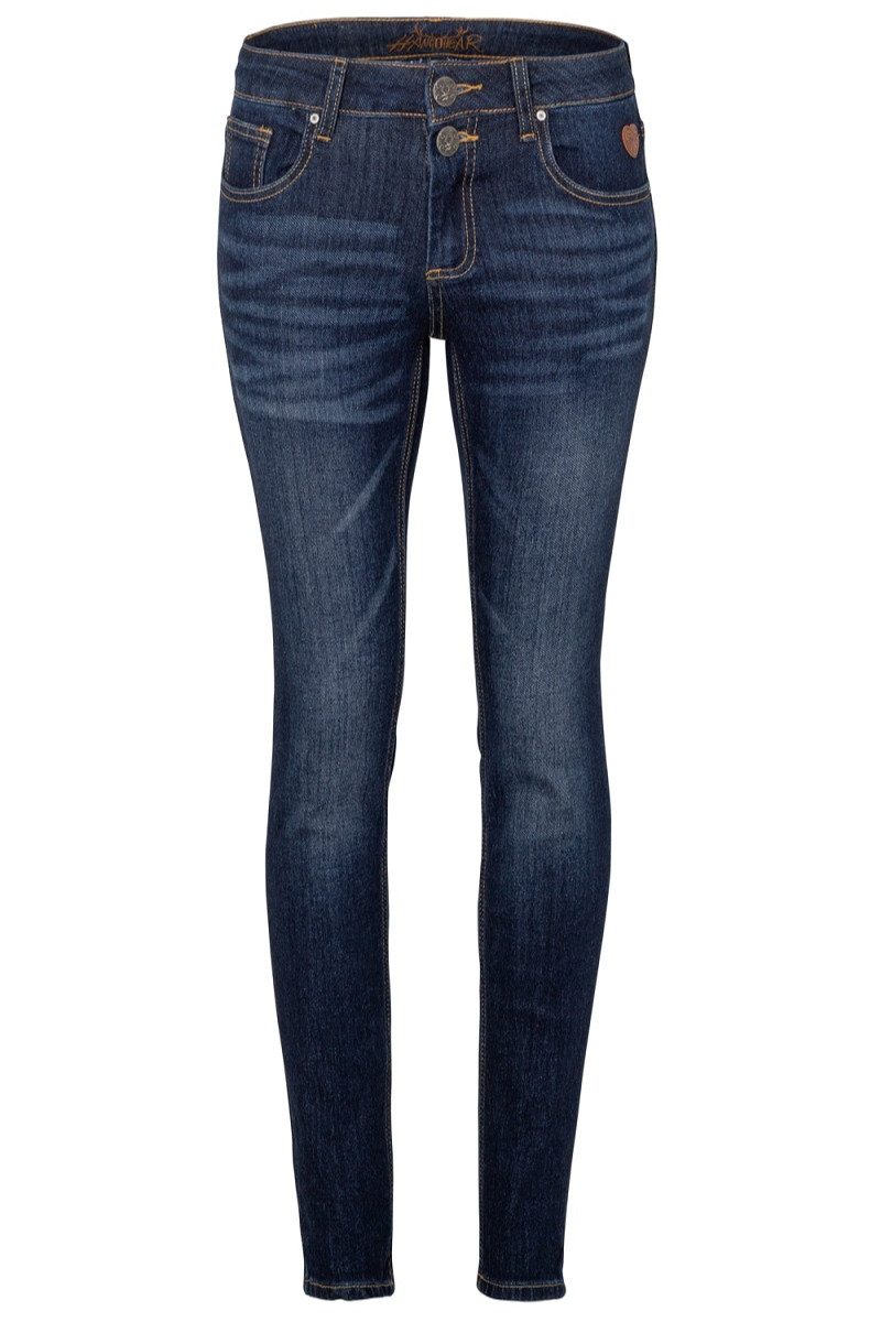 Wanda, die trendy lange Damen Trachtenjeans im Five-Pocket-Stil mit viel Baumwolle und dezenter Waschung mit coolen Bleach-Akzenten vorn, ist körpernah geschnitten und hat einen super bequemen Tragekomfort durch den Stretch-Anteil. Die markanten Nähte sind größtenteils auffällig doppelt in Kontrastfarbe gestaltet. Der Bund verfügt über Gürtelschlaufen und hat hinten rechts einen Marken-Patch im Leder-Look. Als Verschluss dienen zwei altsilberne Knöpfe mit feinem, stilisiertem Hirschkopf-Motiv sowie ein verdeckter Reißverschluss. Vorn gibt es zwei Eingrifftaschen, rechts zusätzlich eine kleine Uhrentasche und hinten zwei aufgesetzte Taschen. Die Tascheneingriffe vorn sind mit Ziernieten betont und über dem Tascheneingriff links schmückt eine niedliche Herz-Applikation im Leder-Look mit dem geprägten Schriftzug "Spatzl" die tolle Damenjeans. Innenseitig hinten unter dem Bund gibt es ein Futter aus floralem Kontraststoff und auch das Taschenfutter ist aus Kontraststoff gefertigt. Die schicke, vielseitige Jeanshose passt super zu Trachtenbluse, Mieder, Trachtenshirt sowie Hoodie und lässt sich auch prima im Alltag kombinieren.