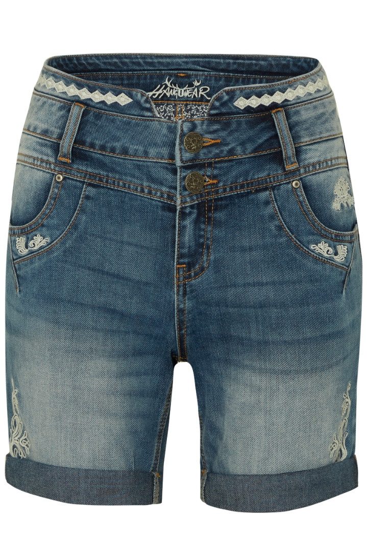 Yonna, die coole, kurze Damenjeans im Trachten-Style, wird mit viel angenehmer Baumwolle gefertigt, hat einen Stretch-Anteil für einen super Tragekomfort, eine modische Waschung mit angedeuteten Sitzfalten sowie kontrastfarbene Nähte in Senfgelb. Der raffiniert gearbeitete, breite Bund im High Waist-Look verfügt über Gürtelschlaufen, hat hinten rechts einen Marken-Aufnäher im Leder-Stil und oben einen separat angebrachten Jeansstoffstreifen mit einer Zierlinie aus gestickten Rauten und einer kecken Aussparung mittig vorn. Geschlossen wird die stylische Trachten Jeansbermuda für Damen mit zwei Knöpfen in Altsilber mit feinem Hirsch-Ornamentik-Motiv sowie einem verdeckten Reißverschluss. Die stretchige Jeans ist beidseitig mit Eingrifftaschen und hinten mit zwei aufgesetzten Taschen versehen. Sowohl die mit trendy Ziernähten sowie -nieten dekorierten Tascheneingriffe, über dem Eingriff links, an den Beinen vorderseitig unten als auch über der Hosensattel-Naht schmücken romantische, florale Ornamentik-Stickreien in Weiß die angesagte Damenhose. Die Gesäßtaschen sind zudem mit einer feschen Falte verziert. Perfekt wird die Kreation, die sich hinreißend zu Trachtenbluse, -Shirt und Hoodie kombinieren lässt, durch die schicken, gekrempelten Beinabschlüsse.