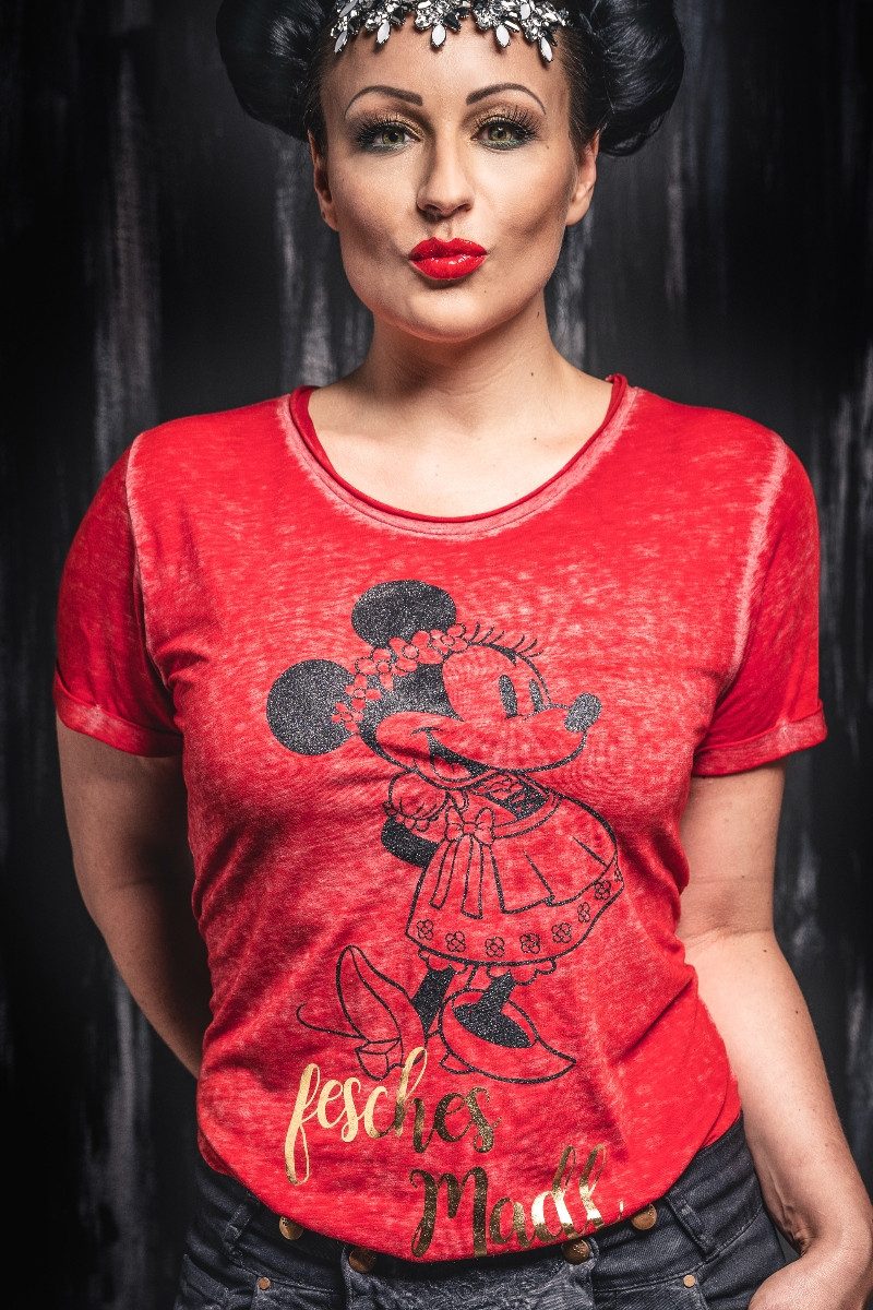 Das niedliche Trachtenshirt Dirndl-Mausi ist ein luftig-weiches, leicht tailliertes kurzarm Shirt für Damen mit Baumwoll-Anteil und schicker Flammgarn-Optik. Der Rundhals-Ausschnitt mit offener Kante und die modischen kurzen Ärmel mit gekrempelten Bündchen geben dem Damenshirt einen zünftigen Touch. Das Highlight ist der schwarze Glitzer-Print vom süßen Kult-Mäuschen im Dirndl mit Blumenkranz und dem golden glänzenden Folien-Aufdruck "fesches Madl" darunter vorn auf dem Damenshirt, das sich entzückend zu Trachtenjeans und Lederhose kombinieren lässt.