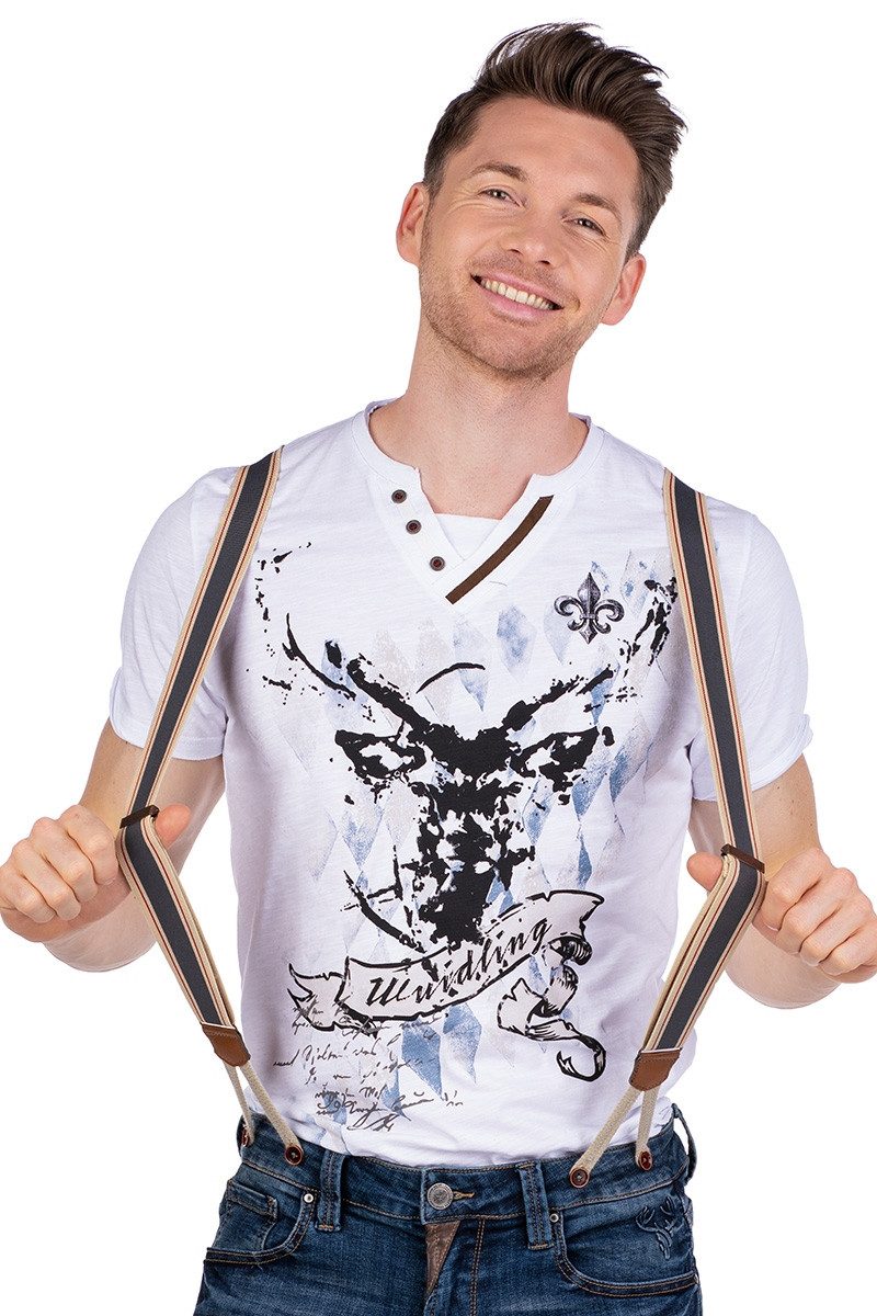 Das sensationelle Herren Trachtenshirt "Fonse Bavaria" besteht aus reiner, angenehmer Baumwolle im Flammgarn-Style. Der angesagte Serafino-Ausschnitt kombiniert Rundhals- und V-Ausschnitt auf modische Weise und ist krachig mit offenen Saumkanten, Zierknöpfen und einer Borte in Veloursleder-Optik geschmückt. Die kurzen Ärmel haben Bündchen im angedeuteten Krempel-Stil und - ebenso wie der gerade Saum - offene Saumkanten. Auf der Vorderseite ist das Shirt mehrfarbig bedruckt und zeigt in der Mitte einen Hirschkopf im Grunge-Style in Schwarz, darunter einen Banner mit dem Schriftzug "Wuidling", oben rechts eine stilisierte Königslilie sowie im Hintergrund stylische Bayernrauten und handschriftlichen Text. Hinten links über dem Saum befindet sich ein kleiner Marken-Print. Das Trachtenshirt passt super zu Lederhose und Trachtenjeans. Bitte beachten Sie den Größenzuschlag bei Размер 4XL.