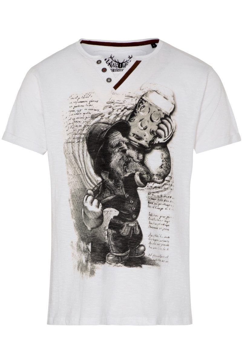 Dieses fetzige kurzarm Trachtenshirt "Freibier" für Herren ist aus reiner Baumwolle im Flammgarn-Style gefertigt und bietet einen hohen Tragekomfort. Der trendy Serafino-Ausschnitt, eine Kombination aus Rundhals- und V-Ausschnitt, verleiht dem Shirt eine moderne Note. Die V-Partie ist auf einer Seite mit einer Stoffborte und Zierknöpfen und auf der anderen mit einer Borte im Veloursleder-Stil dekoriert. Der Rundhals-Ausschnitt sowie die Bündchen der kurzen Ärmel sind mit offenen Saumkanten versehen, während die Bündchen zudem im angedeuteten Krempel-Stil gestaltet sind. Auf der Vorderseite ist das Shirt krachig in Schwarz und Grau mit Akzenten in Sepia bedruckt. Das Motiv zeigt den Kopf vom Alpen-Seppl mit Trachtenhut und Vollbart, kombiniert mit dem Körper eines bekannten Comic-Seemanns in Lederhose und Karohemd. Die kräftigen Unterarme und der Masskrug in der linken Hand des Charakters sorgen für einen auffälligen Look. Der Hintergrund ist mit einem Wirbel und Text in alter Schrift gestaltet. Rückseitig über dem Saum links befindet sich ein kleiner Marken-Print. Dieses Trachtenshirt passt cool zu Lederhose und Trachtenjeans. Beachten Sie bitte den Größenzuschlag bei Размер 4XL.