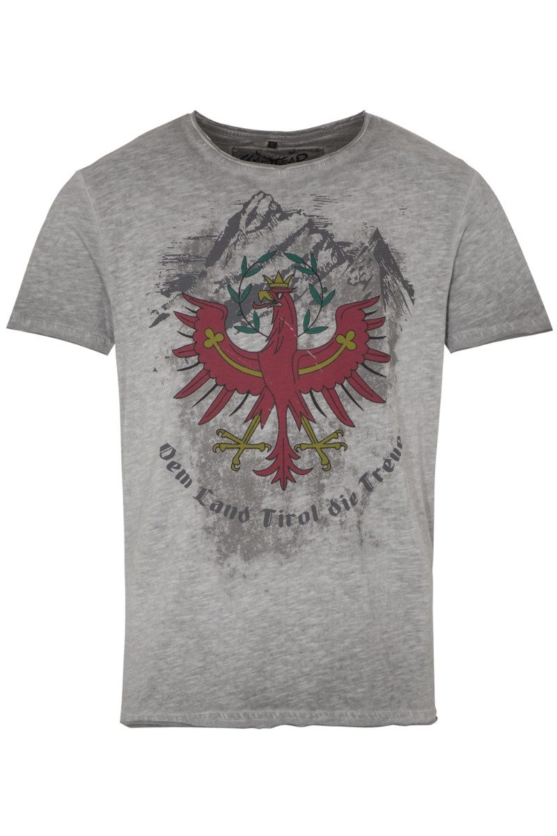 Dieses kernige Trachtenshirt für Herren besteht aus reiner Baumwolle im Flammgarn-Look, bietet ein angenehmes Tragegefühl und hat eine tolle Stoffqualität. Der Rundhals-Ausschnitt, die Bündchen der kurzen Ärmel sowie der Saum sind mit offenen Kanten gestaltet. Vorn schmückt ein fantastischer, farbiger Print vom Tiroler Wappen-Adler das Herrenshirt. Das Motiv vom roten, golden gekrönten Adler mit goldenen Kleestängeln und grünem Ehrenkranz wird darüber durch schraffierte, felsige Berge und darunter durch den Schriftzug "Dem Land Tirol die Treue" in alter Schrift komplettiert. Über dem Saum hinten links befindet sich ein kleiner Marken-Print. Das T-Shirt lässt sich super zu Lederhose und Trachtenjeans kombinieren. Bitte beachten Sie den Größenzuschlag bei Размер 4XL.