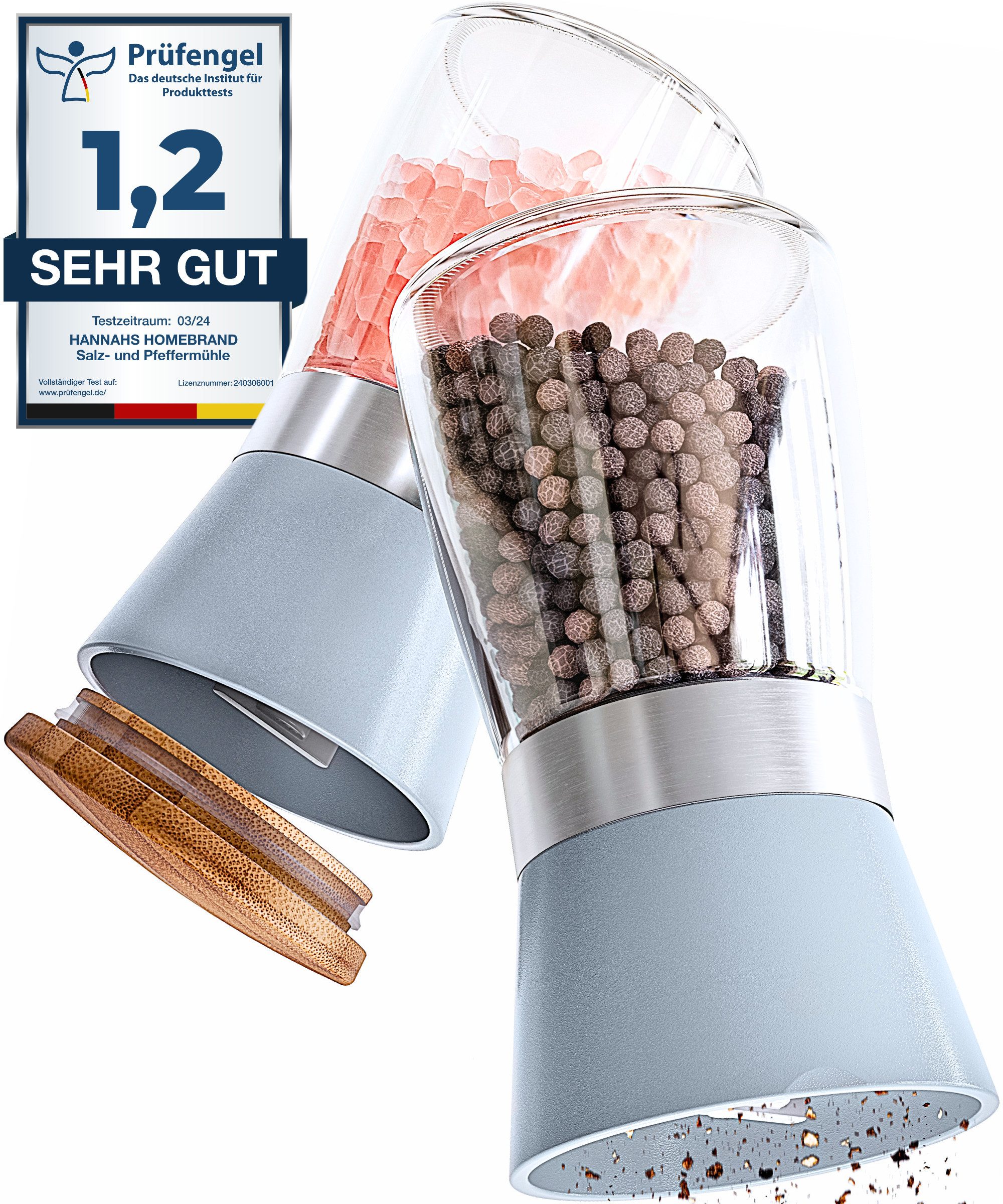 Top-Features | Salz und Pfeffermühle von grob bis fein einstellbar Salzmühle und Pfeffermühle mit extra hartem Keramikmahlwerk Manuell bedienbare Gewürzmühle Pastellfarben weiß grau und blau |