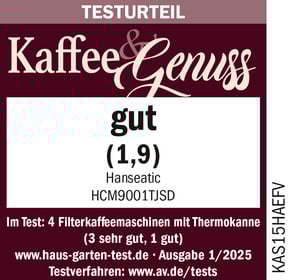 Das Magazin „Haus & Garten Test“ testet die Hanseatic HCM9001TJSD im Vergleichstest mit drei weiteren Filterkaffeemaschinen mit Thermokanne. Erschienen ist der Vergleichstest erneut im Sonderheft „Kaffee & Genuss“. Bei den Funktionen punkten die schnelle Zubereitungsdauer, die „gute“ Brühtemperatur und das Warmhalten klappt auch hervorragend, nur die Kaffeetemperatur liegt „deutlich unter dem Durchschnitt des Testfeldes“. Das Gerät ist einfach zu bedienen und zu reinigen. Es ist „gut“ verarbeitet und auch der Stromverbrauch ist sehr gering. Außerdem ist die Sicherheit „sehr gut“. Die Kaffeemaschine erzielt das Gesamtergebnis „gut (1,9)“.
