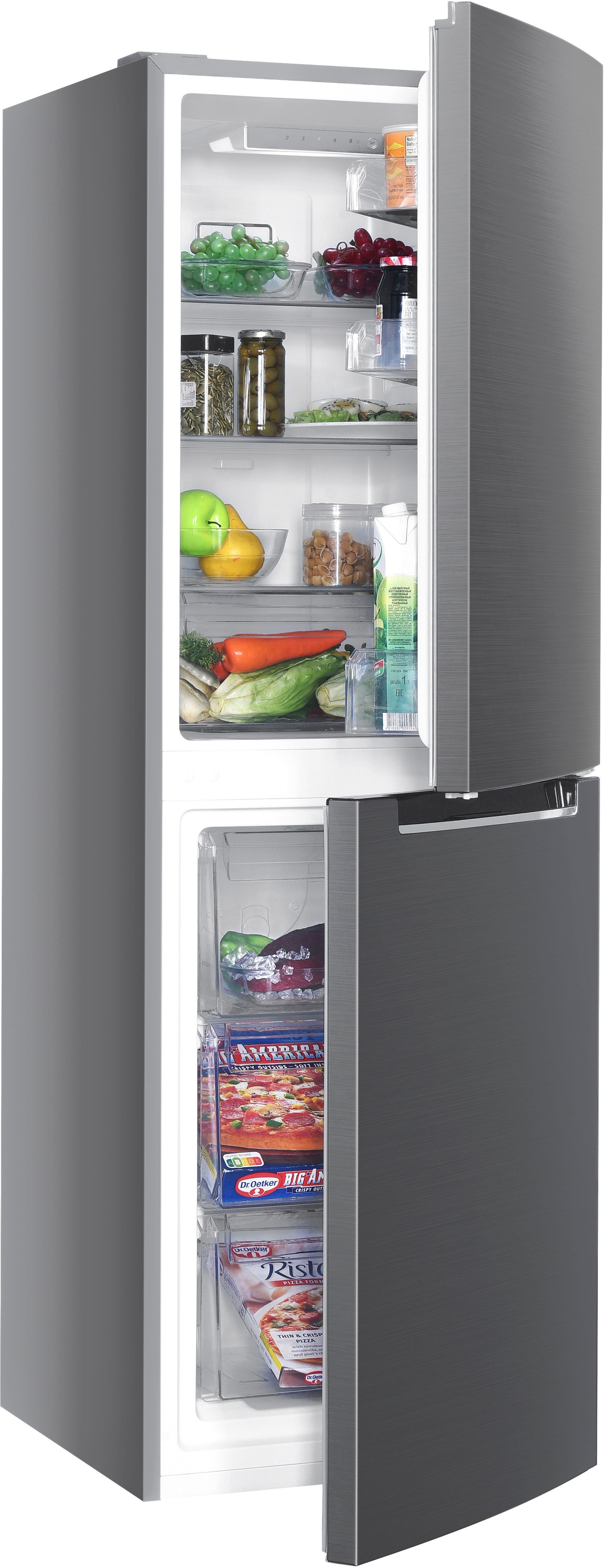 Die »HKGK16655CNFI« ist eine freistehende Kühl- und Gefrierkombination von Hanseatic und überzeugt mit hoher Funktionalität sowie der Energieeffizienzklasse C (Skala Energieeffizienzklasse A bis G). Bei einem Gefriervolumen von 86 l und Kühlvolumen von 144 l betragen die Maße des Modells 54 x 167 x 63 cm (B/H/T). Das Betriebsgeräusch des Modells liegt bei 38 dB. Drei Gefrierschubladen und eine Gemüseschublade stehen zur Verfügung, um den Einkauf zu verstauen. Die Kühl- und Gefrierkombination hat drei Ablageflächen aus Sicherheitsglas, die viel Platz für Lebensmittel bieten. Die drei Türablagen ermöglichen eine übersichtliche Lagerung. Die Schnellgefrier-Funktion sorgt dafür, dass sich die Lebensmittel besonders schnell kühlen und einfrieren lassen. Steht die Tür zu lange offen, gibt die Kühl- und Gefrierkombination ein akustisches Warnsignal. Den Überblick behält man außerdem durch die LED-Innenbeleuchtung. Wer auf der Suche ist nach einem Gerät, das ausreichend Raum für Nahrungsmittel bietet, der trifft mit der »HKGK16655CNFI« von Hanseatic eine gute Wahl.