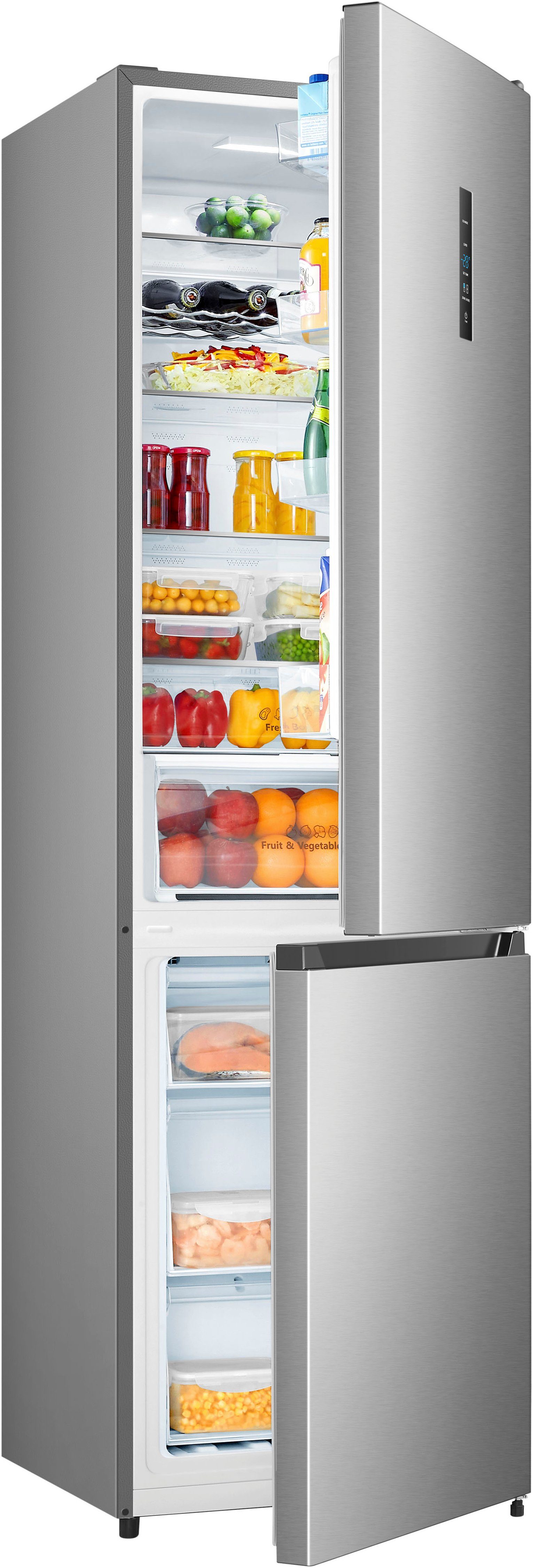 Die Kühl- und Gefrierkombination »HKGKB20060BNFI« von Hanseatic hat eine hohe Funktionalität sowie die Energieeffizienzklasse B (Skala Energieeffizienzklasse A bis G) und ist freistehend. Ausreichend Platz bietet das 59,5 x 201,7 x 57,9 cm (B/H/T) große Gerät mit seinen 98 l Gefriervolumen und 238 l Kühlvolumen. Das Betriebsgeräusch des Modells liegt bei 35 dB. Es sind drei Gefrierschubladen und zwei Gemüseschubladen zum Verstauen des Einkaufs integriert. Auf fünf Ablageflächen, davon vier höhenverstellbar, ist in der Kühl- und Gefrierkombination genug Raum für Lebensmittel. Zusätzliche Variabilität bei der Lagerung bieten die vier Türablagen. Besonders schnell kühlen und einfrieren lassen sich die Lebensmittel durch die Supergefrier-Funktion. Perfekte Übersichtlichkeit erhält man außerdem dank der LED-Innenbeleuchtung. Wer auf der Suche ist nach einem Gerät, das ausreichend Raum für Lebensmittel bietet, der trifft mit der »HKGKB20060BNFI« von Hanseatic eine gute Wahl.