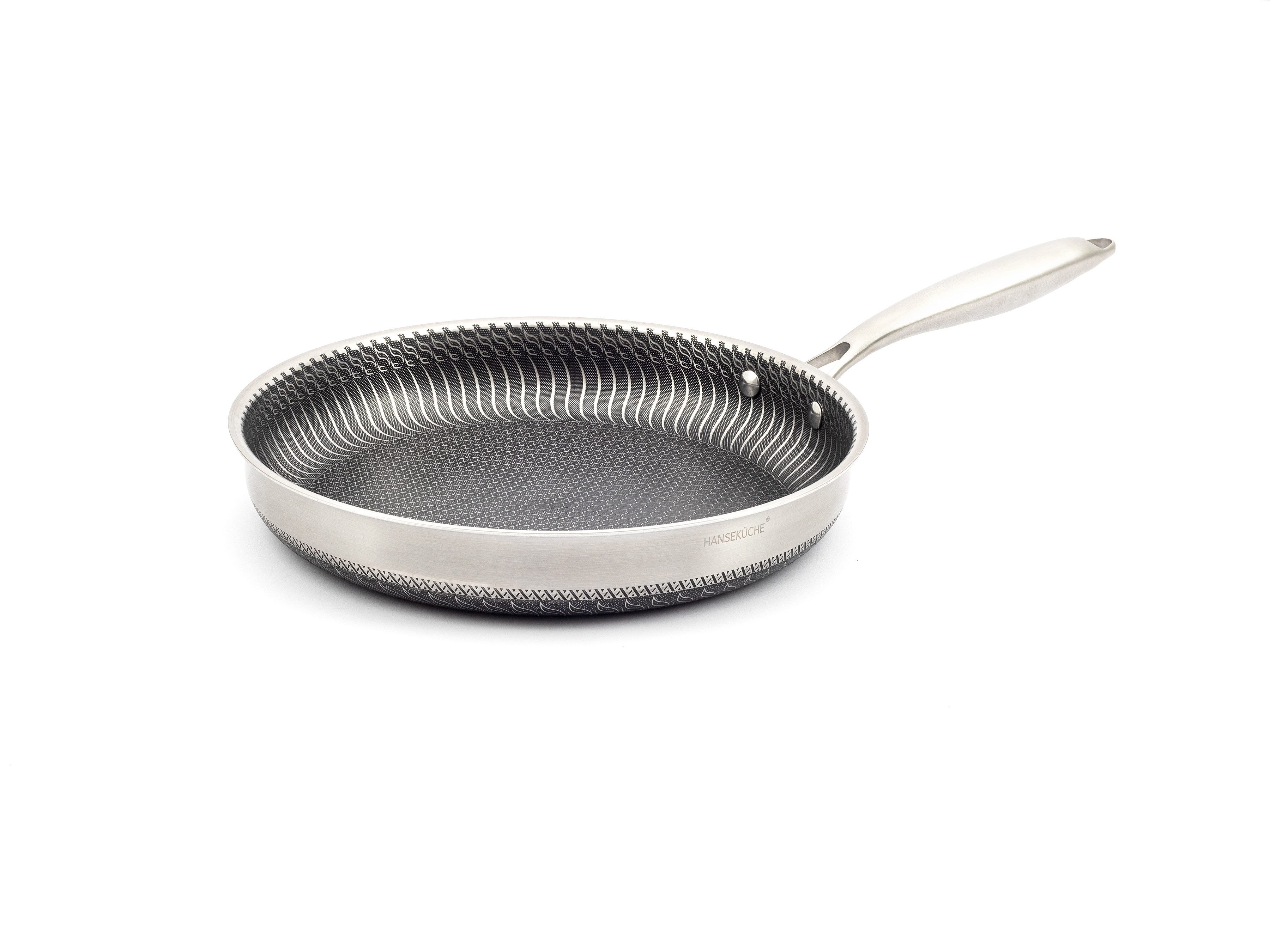 Die Pfanne ist aus drei Schichten, auch bekannt als "Tri-Ply", gefertigt, die für eine gleichmäßige Wärmeverteilung sorgen und somit perfekte Bratergebnisse garantieren. Wir beginnen mit einer Schicht aus magnetischem 304 Edelstahl. Dies stellt sicher, dass die Pfanne auf jedem Herd - Gas, Keramik oder Induktion - funktioniet. Danach folgt eine Schicht Aluminium, die für eine gleichmäßige Hitzeverteilung sorgt. Darauf liegt eine abschließende Schicht 430 Edelstahl.