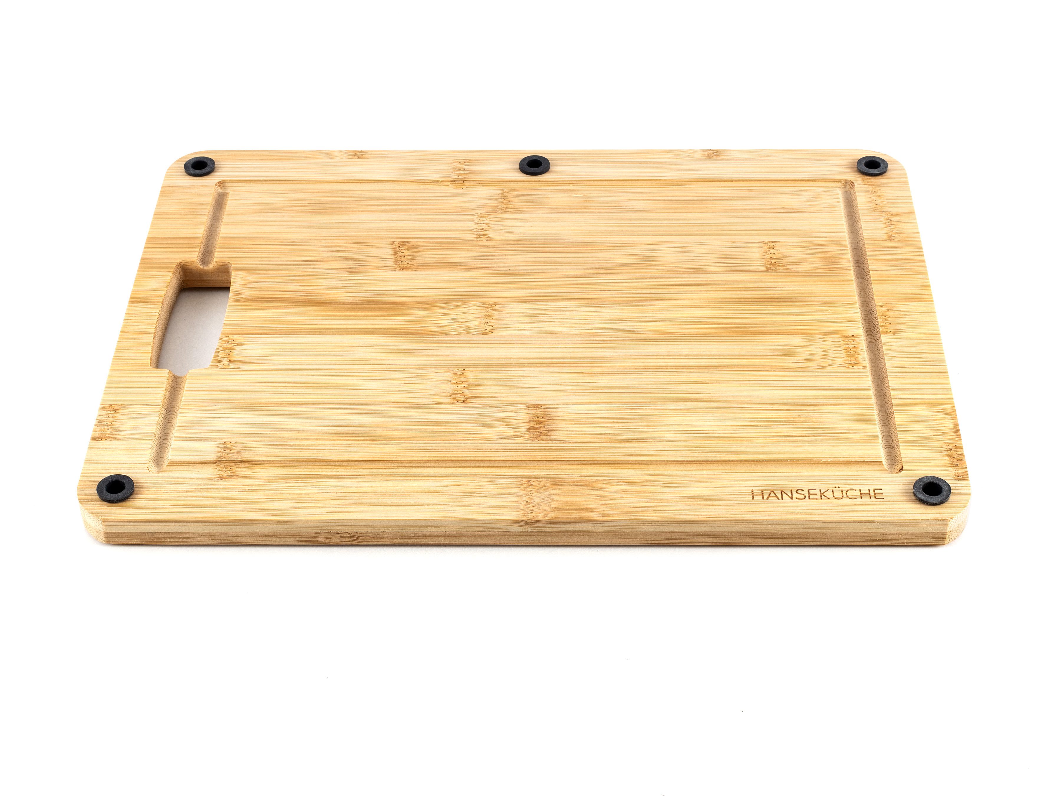 RUTSCHFEST & FLEXIBEL EINSETZBAR – Die speziell entwickelten Silikonfüße sorgen für optimalen Halt und ermöglichen sicheres, entspanntes Arbeiten. Dank der cleveren Wende-Funktion kannst du Fleisch, Obst oder Gemüse auf einer Seite schneiden und das Brett einfach drehen – ganz ohne lästiges Zwischenspülen. HYGIENISCH & ANTIBAKTERIELL – Die glatte Oberfläche des Schneidebretts ist besonders leicht zu reinigen und wirkt von Natur aus antibakteriell. Im Gegensatz zu Kunststoffbrettern, auf denen sich Bakterien trotz Spülmaschine halten können, bietet Bambus eine hygienische Alternative. NACHHALTIG & ROBUST – Gefertigt aus natürlichem Bambus, einem schnell nachwachsenden Rohstoff, überzeugt unser Schneidebrett durch Langlebigkeit und Umweltfreundlichkeit. Die massive 1,5 cm Materialstärke sorgt für hohe Stabilität – und dank plastikfreier Verpackung leisten wir gemeinsam einen Beitrag zur Эко-товары. UMFASSENDER & SCHNELLER KUNDENSERVICE - Wir sind für Sie da! Ihre Zufriedenheit ist für uns am allerwichtigsten. Wir möchten sicher gehen, dass Sie 100% zufrieden mit Ihrem Kauf sind. Sollten Sie Fragen oder Probleme mit Ihrer Bestellung oder Ihrem Hanseküche Schneidebrett haben, schreiben Sie uns bitte sofort. Wir werden uns umgehend und persönlich um Ihr Anliegen kümmern.