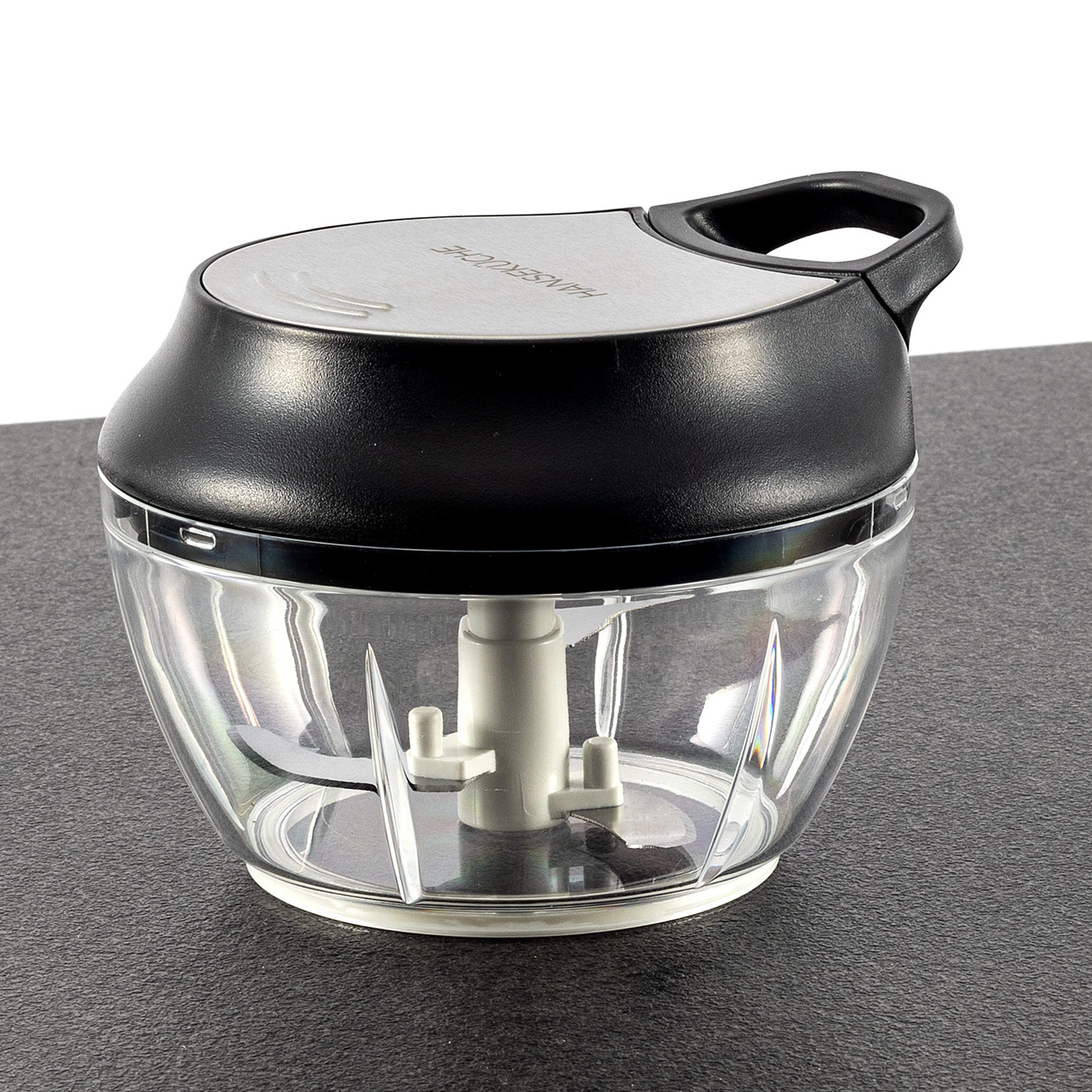 Der Zerkleinerer ist durch Silikon am Boden, Anti-rutsch-Streifen auf dem Deckel und ergonomischen Griff sicher in der Hand haltbar. Все Komponenten sind lebensmittelfreundlichen und BPA-frei.