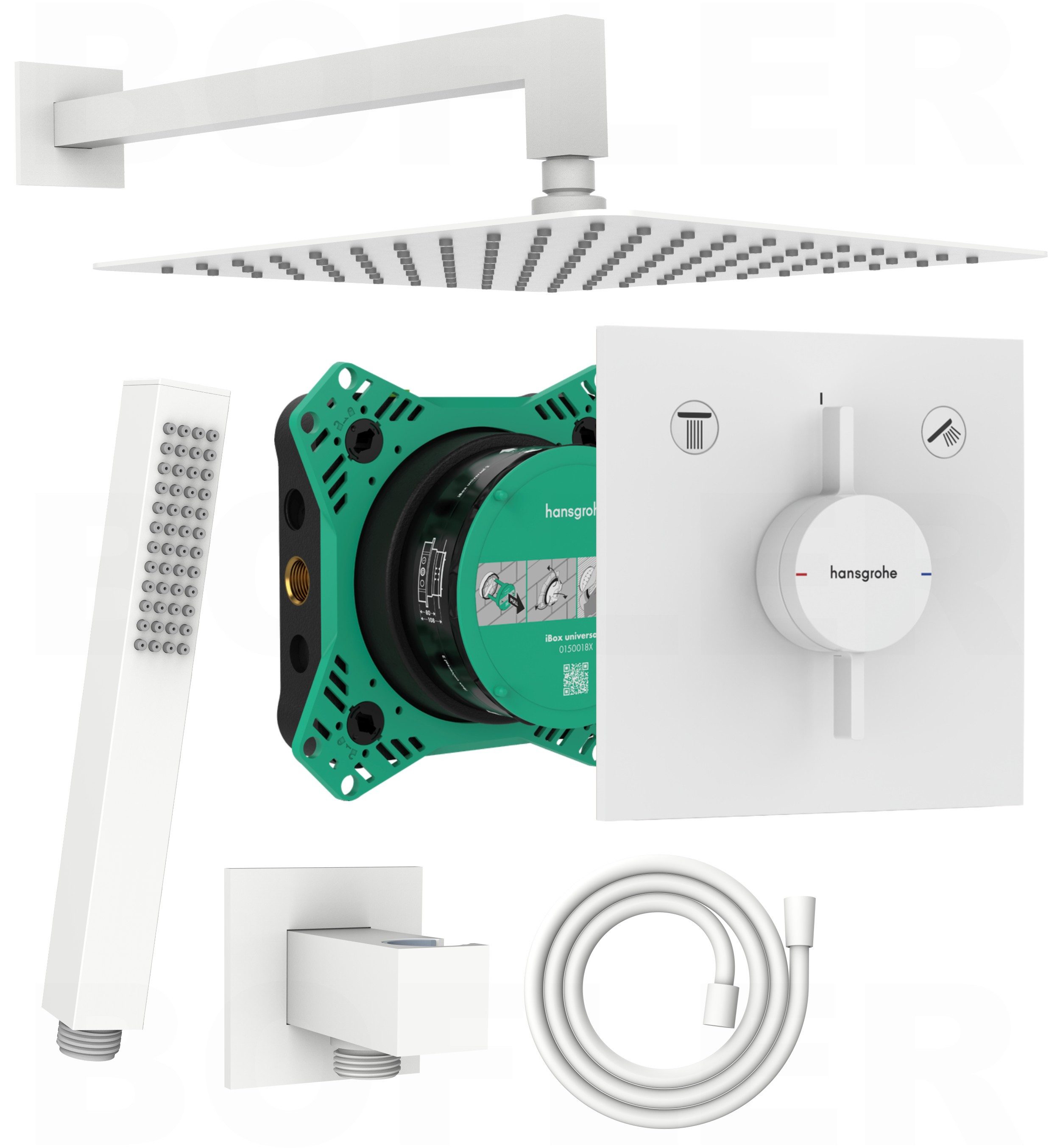 Premium Design Unterputz Duschanlage mit Hansgrohe DuoTurn E Unterputz Mischer für zwei Verbraucher und Hansgrohe I-Box 2 Einbaukörper. Premium Brauseartikel "QUADRO" von BOFLER, komplett matt weiß