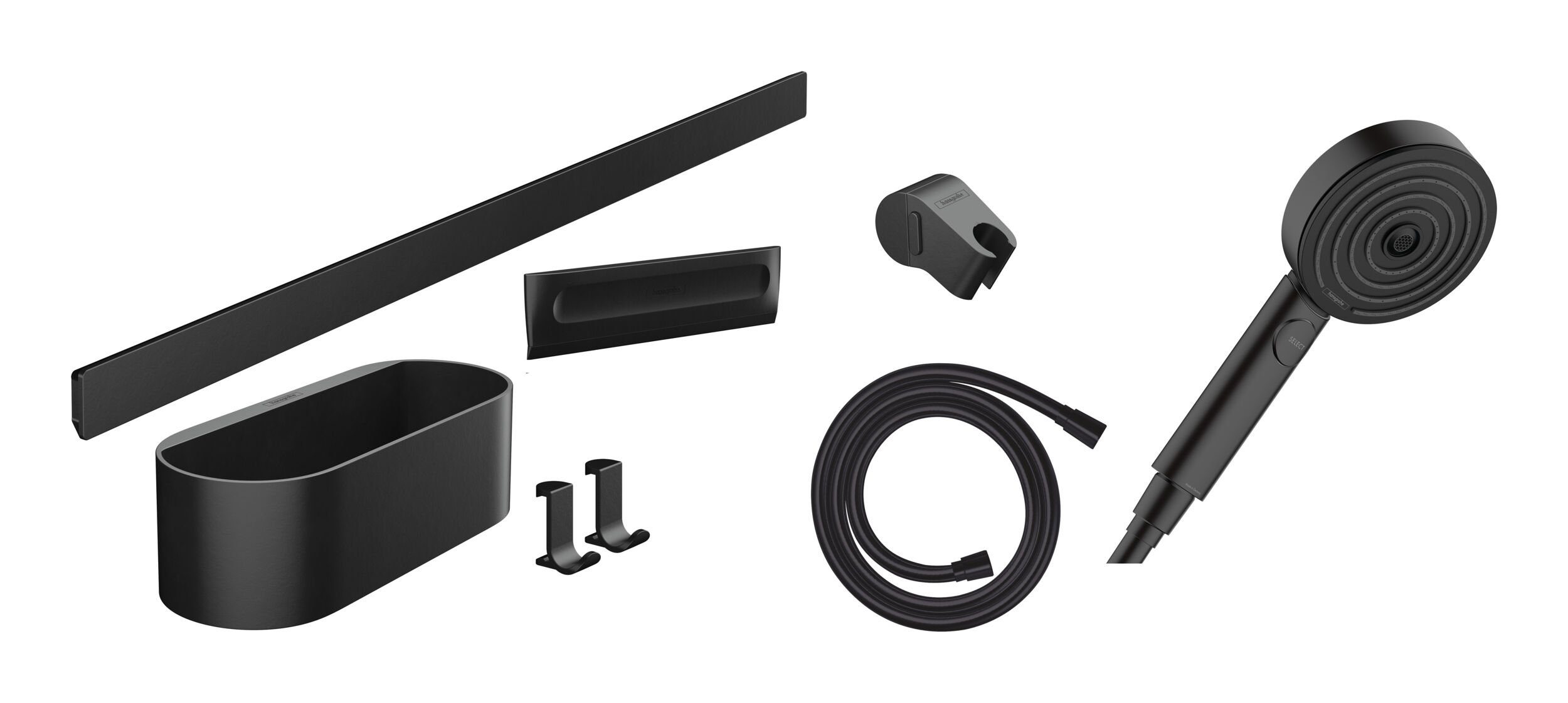 Lieferumfang | Handbrause, Brauseschlauch, Wandstange, Ablagekorb, Handtuchhaken, Handbrausehalterung, Duschabzieher |