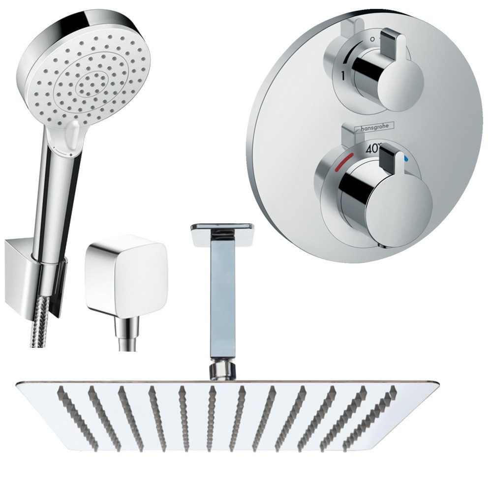 Lieferumfang | [OPTIONAL] Hansgrohe iBox 1 Grundkörper universal, 01800180 Hansgrohe Ecostat S Thermostat Unterputz für 2 Verbraucher, 15758000 Hansgrohe Crometta Vario Porter Set 1,25m, 26691400 Hansgrohe Fixfit Schlauchanschluss, 26457000 Jowi Kopfbrause AUSWAHL: 250mm, 300mm oder 360mm Jowi Deckenanschluss, Gesamtlänge: 155mm |